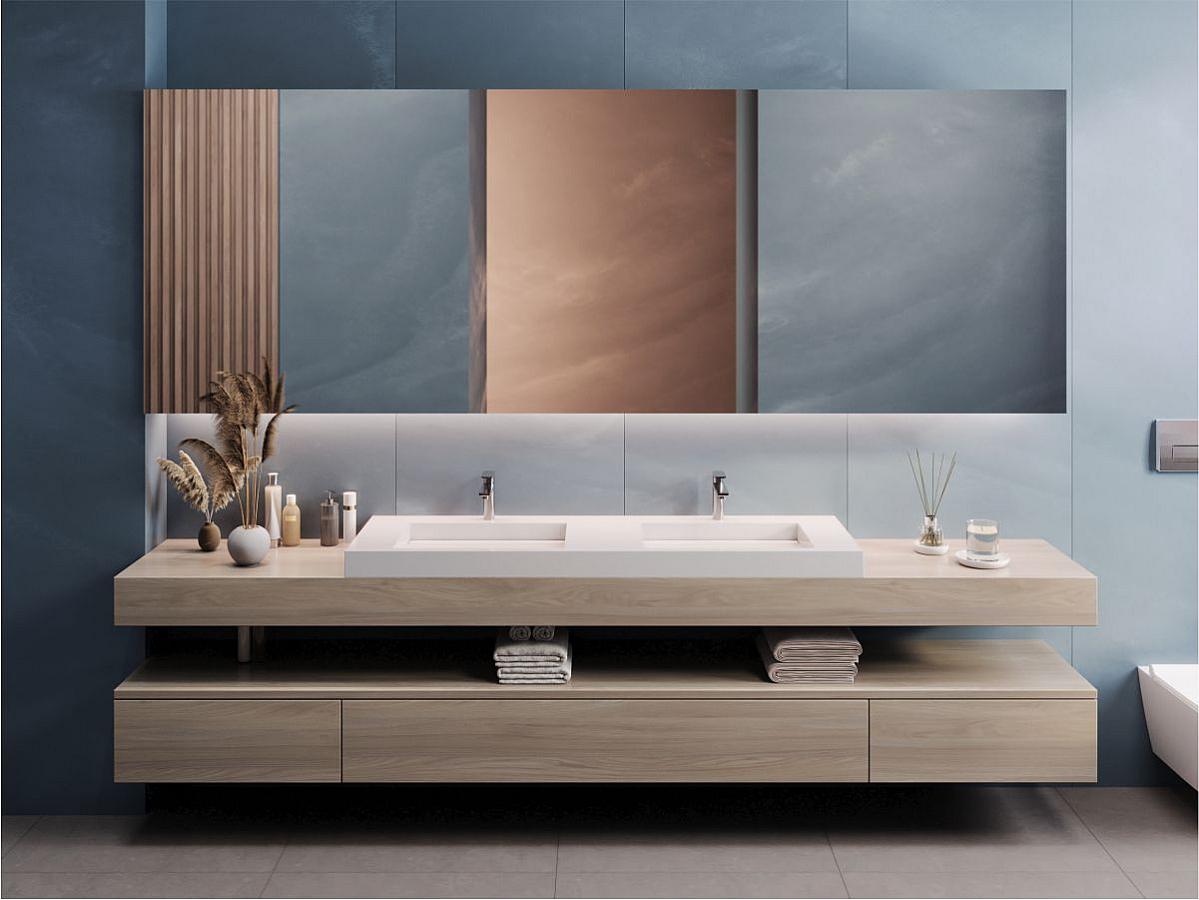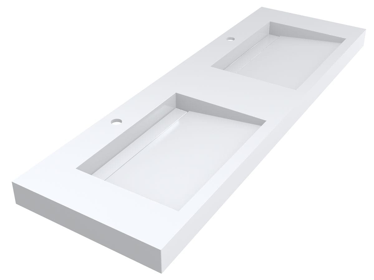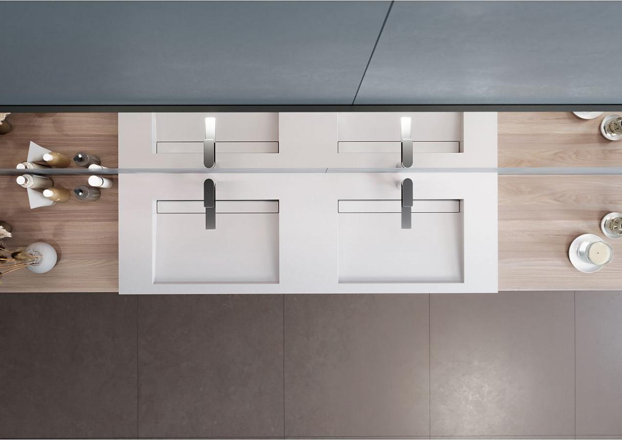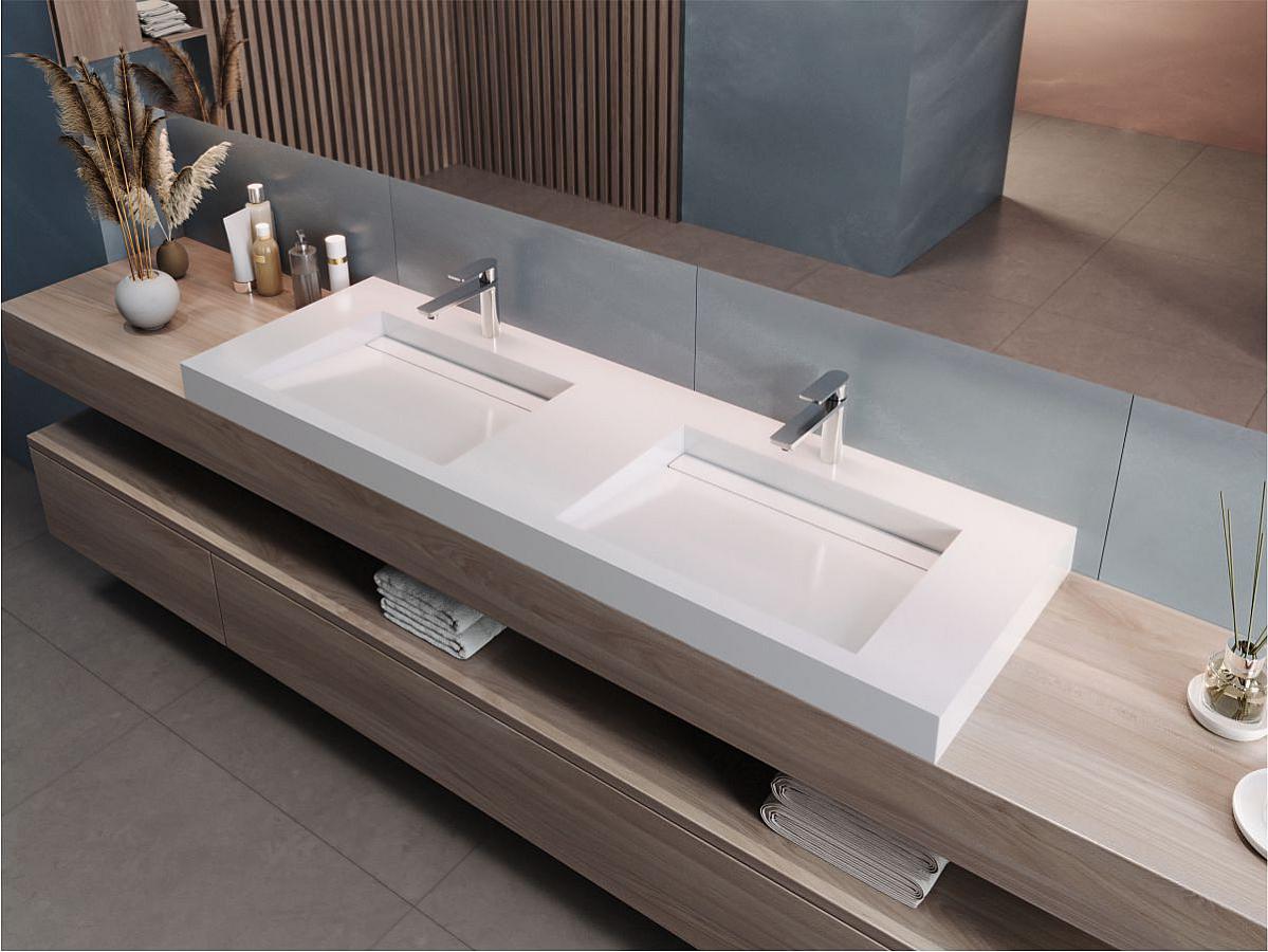 Плоский умивальник із литого мармуру AGNESS 1500 з двома прямокутними чашами без крил стане прекрасним доповненням ванної кімнати в стилі мінімалізм. Раковина має накладний спосіб монтажу та легко встановлюється на тумбу чи полицю в ванній кімнаті. На бортах умивальника можна розмістити косметичні засоби. Отвір під злив приховано декоративною накладкою.