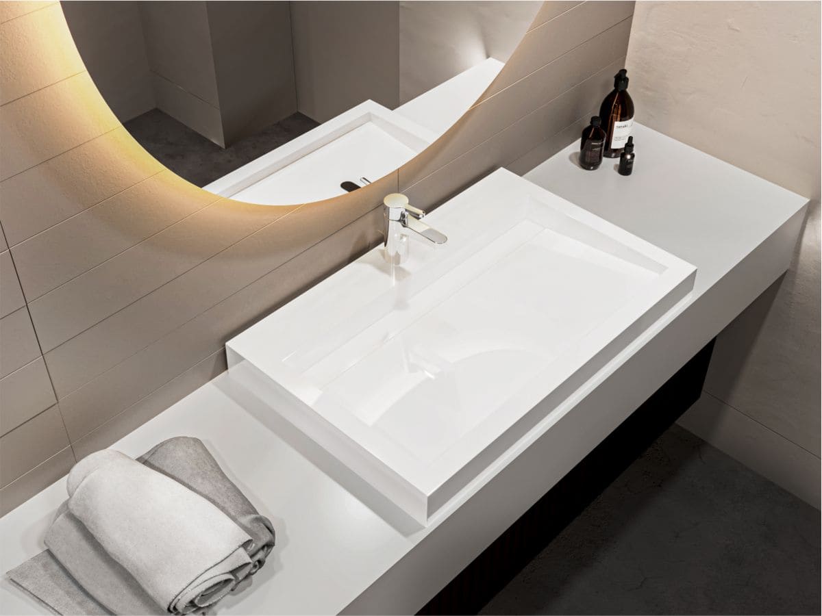 Сантехніка MIRAGGIO виробляється за авторською технологією змішування мармуровою крихти та поліефірної смоли в вакуумі. Матеріал умивальника - MIRAMARBLE. В його структурі відсутні мікропори, що виключає розвиток бактерій в товщі стінок. Додатково виріб покритий антибактеріальним гелем. Поверхня умивальника глянцева.