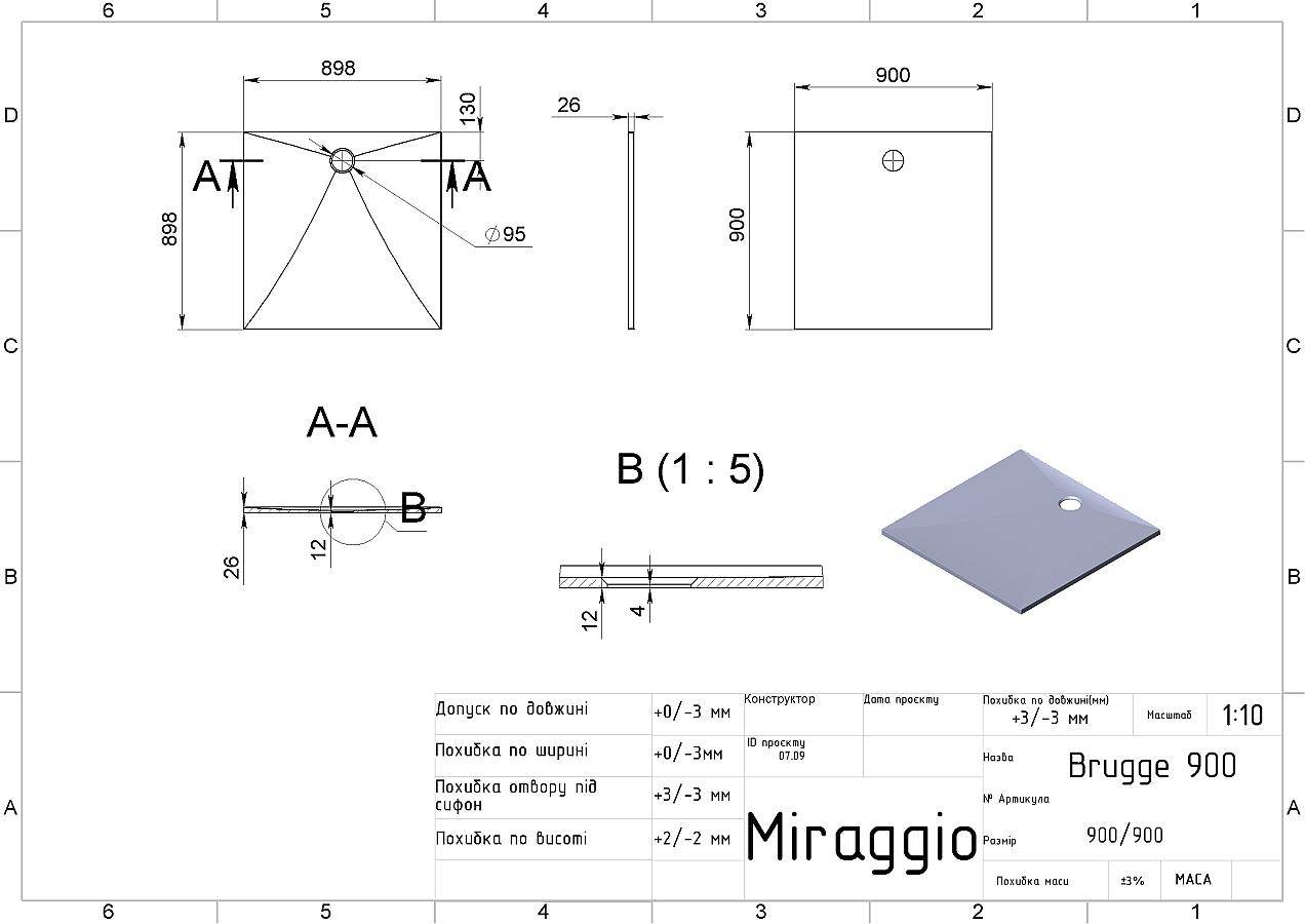 Піддон має форму майже квадрата (902*899 мм), а висота складає 26 мм.