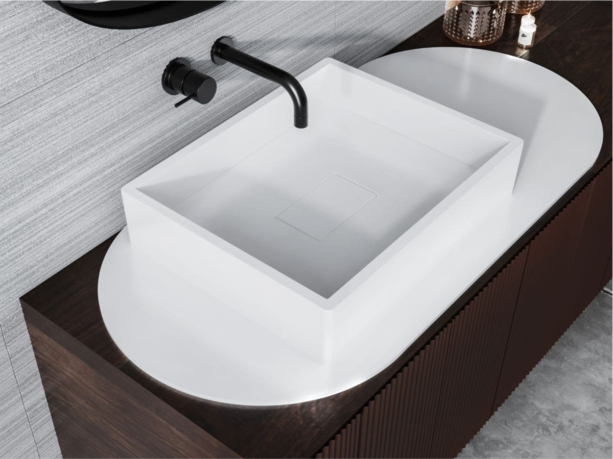 Прямокутний умивальник із литого мармуру CAPRI у стилі класичного box-а чудово доповнить інтер'єр невеликої ванної кімнати. Раковина має накладний спосіб монтажу та легко встановлюється на тумбу або полицю у ванній кімнаті. Отвір під слив прихований декоративною накладкою.