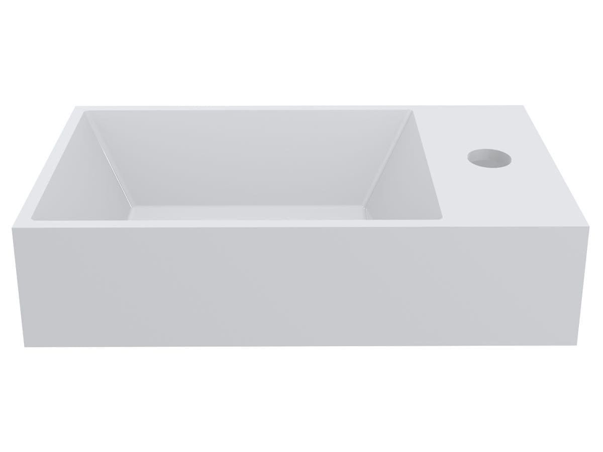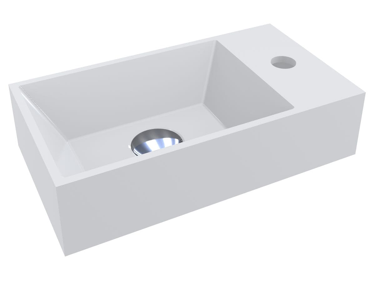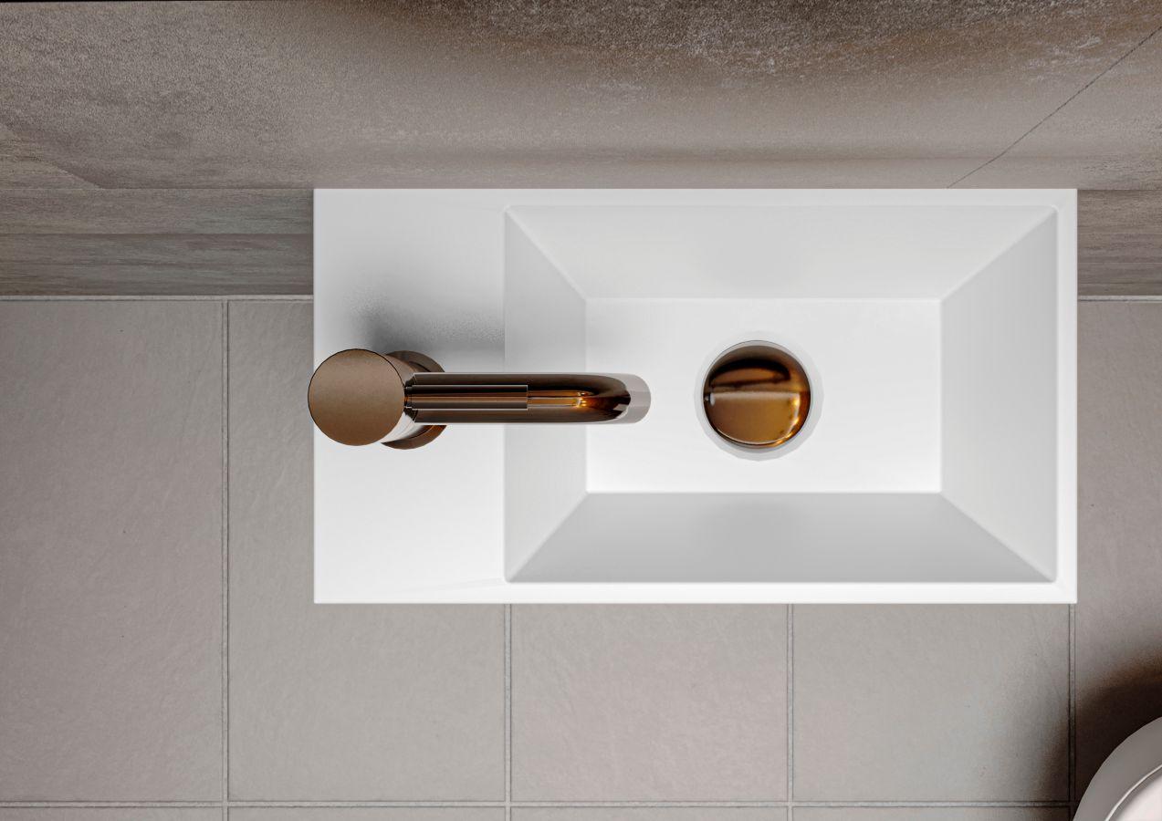 Прямокутний умивальник із литого мармуру COPPER 400 з глибокою трапецієподібною чашею - зручний аксесуар для невеликої ванної кімнати. Раковина має накладний спосіб монтажу та легко встановлюється на тумбу або полицю у ванній кімнаті. Отвір під змішувач розміщено збоку, що дозволяє розмістити умивальник впритул до вертикальної поверхні.