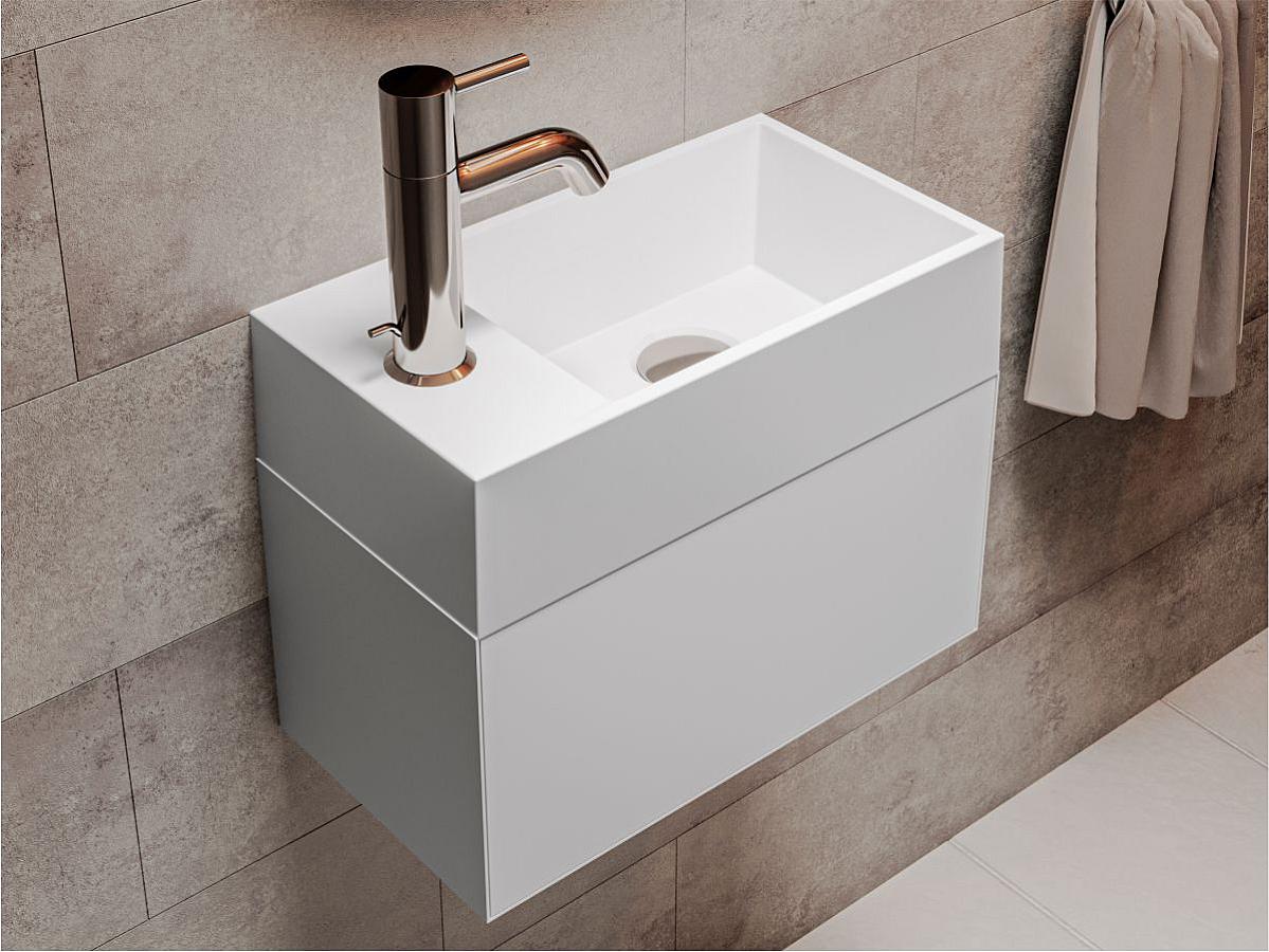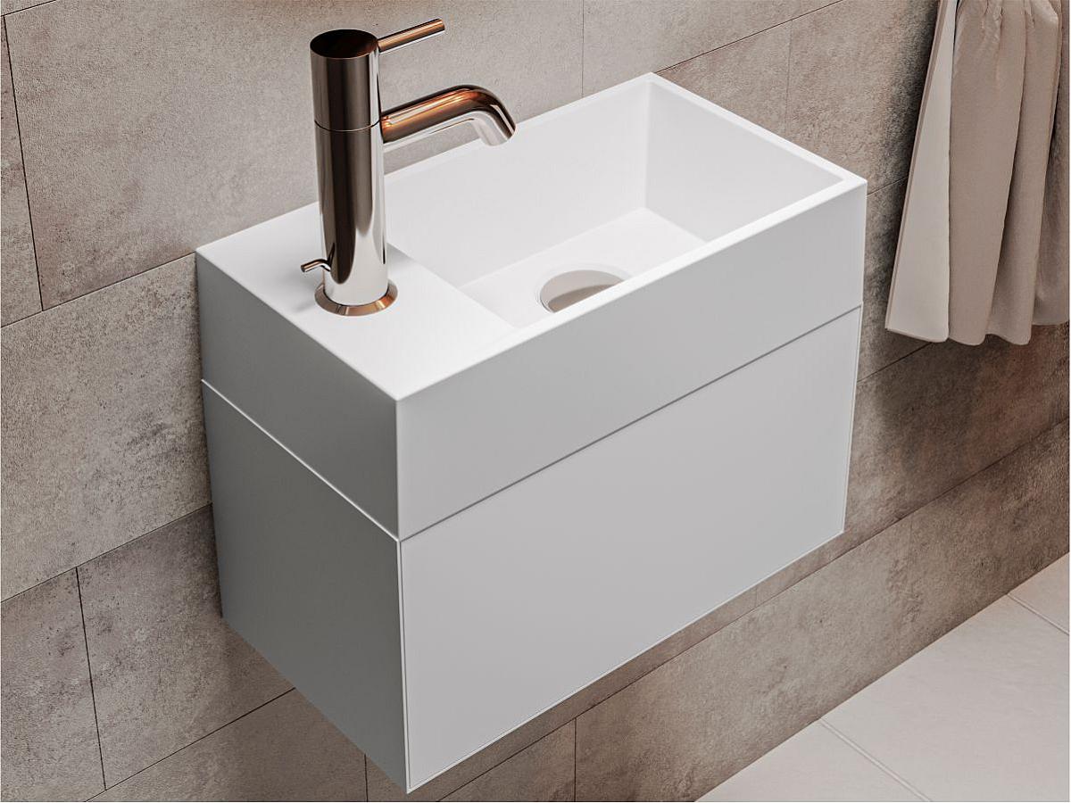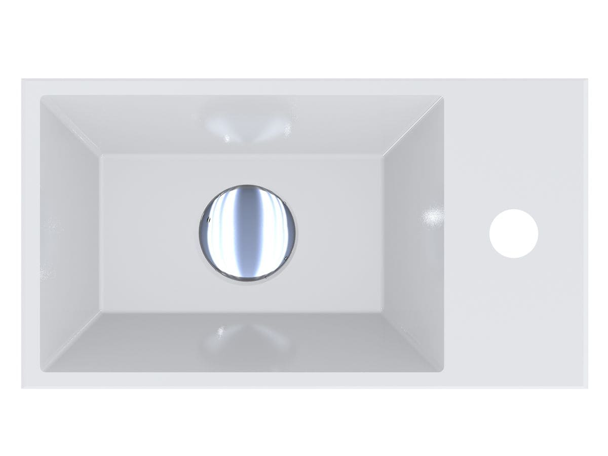 Прямокутний умивальник із литого мармуру COPPER 400 з глибокою трапецієподібною чашею - зручний аксесуар для невеликої ванної кімнати. Раковина має накладний спосіб монтажу та легко встановлюється на тумбу або полицю у ванній кімнаті. Отвір під змішувач розміщено збоку, що дозволяє розмістити умивальник впритул до вертикальної поверхні.