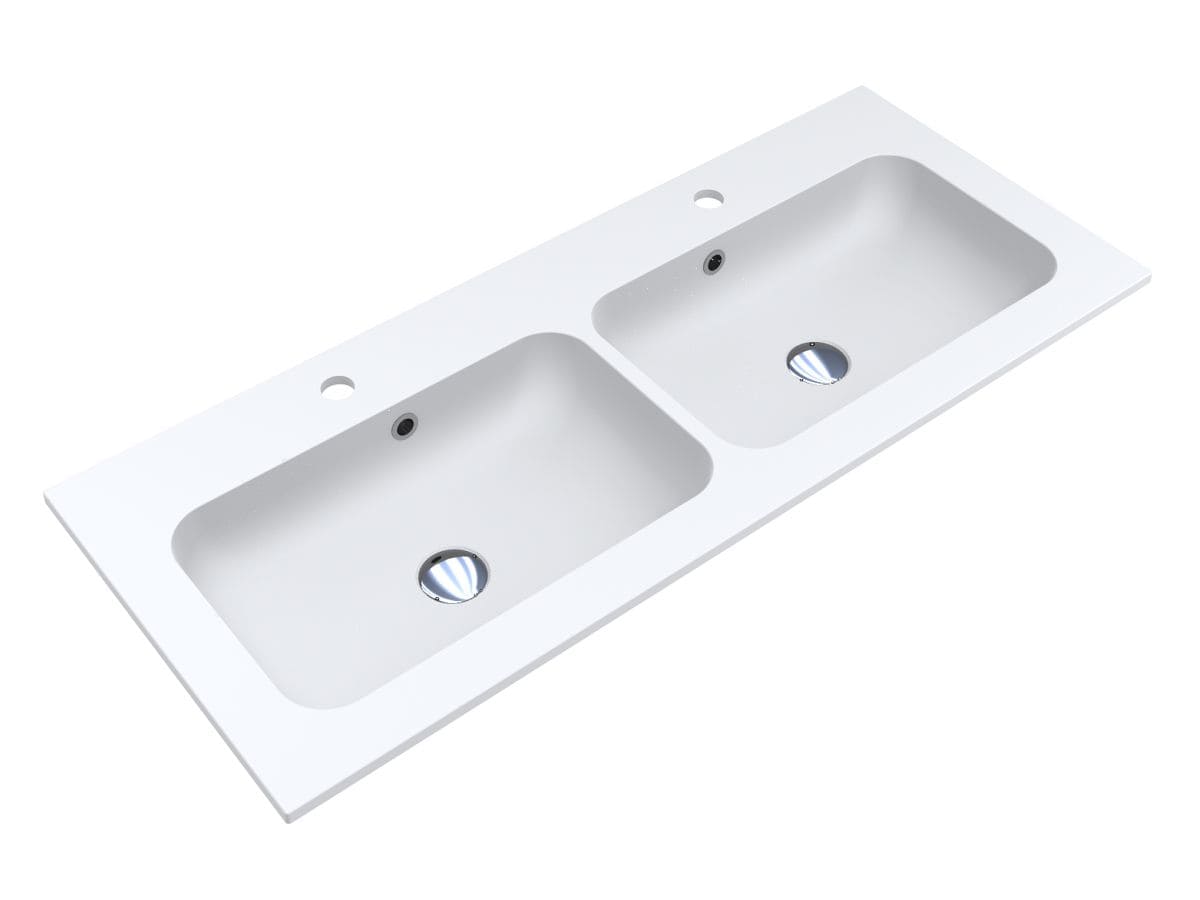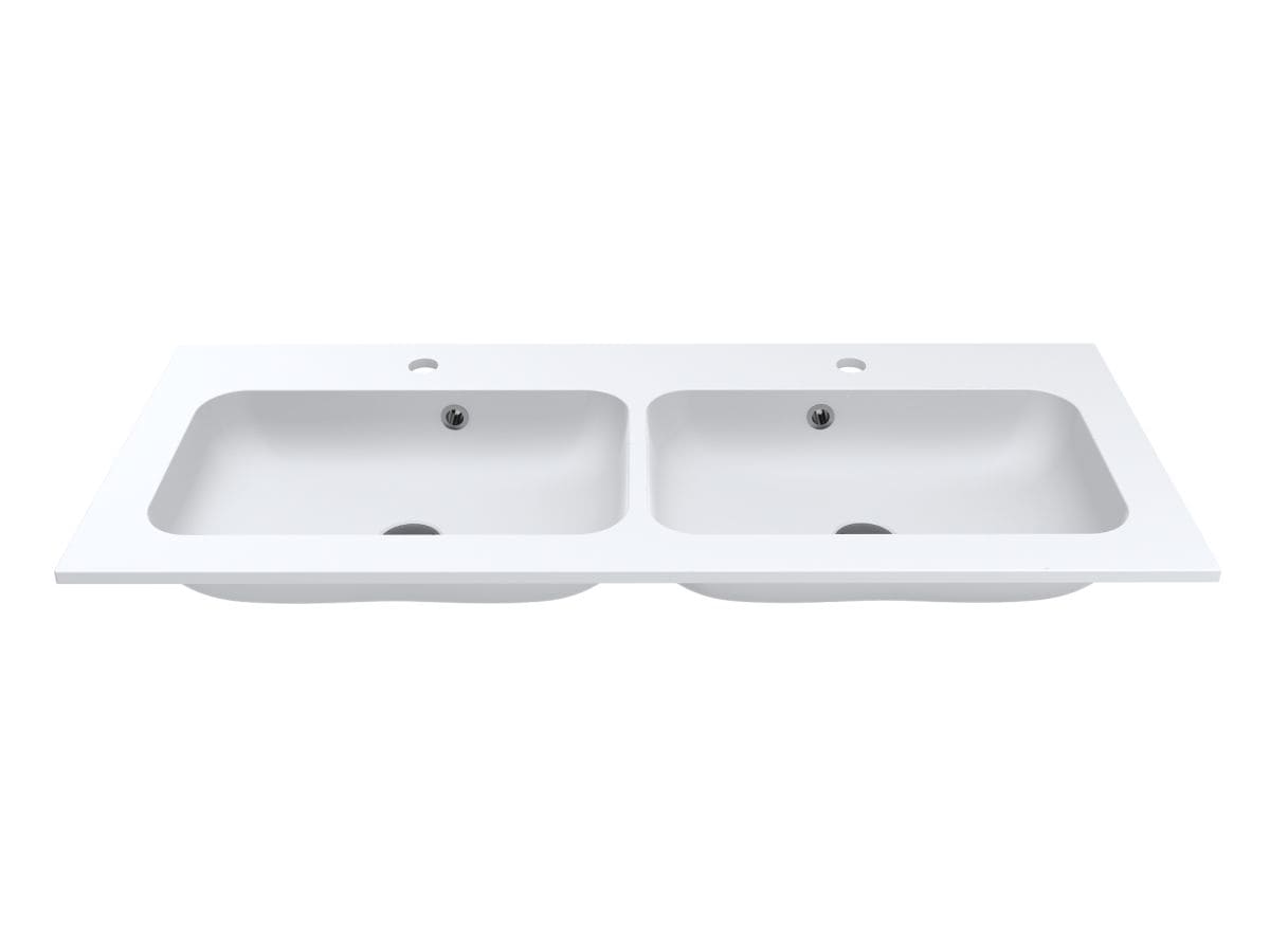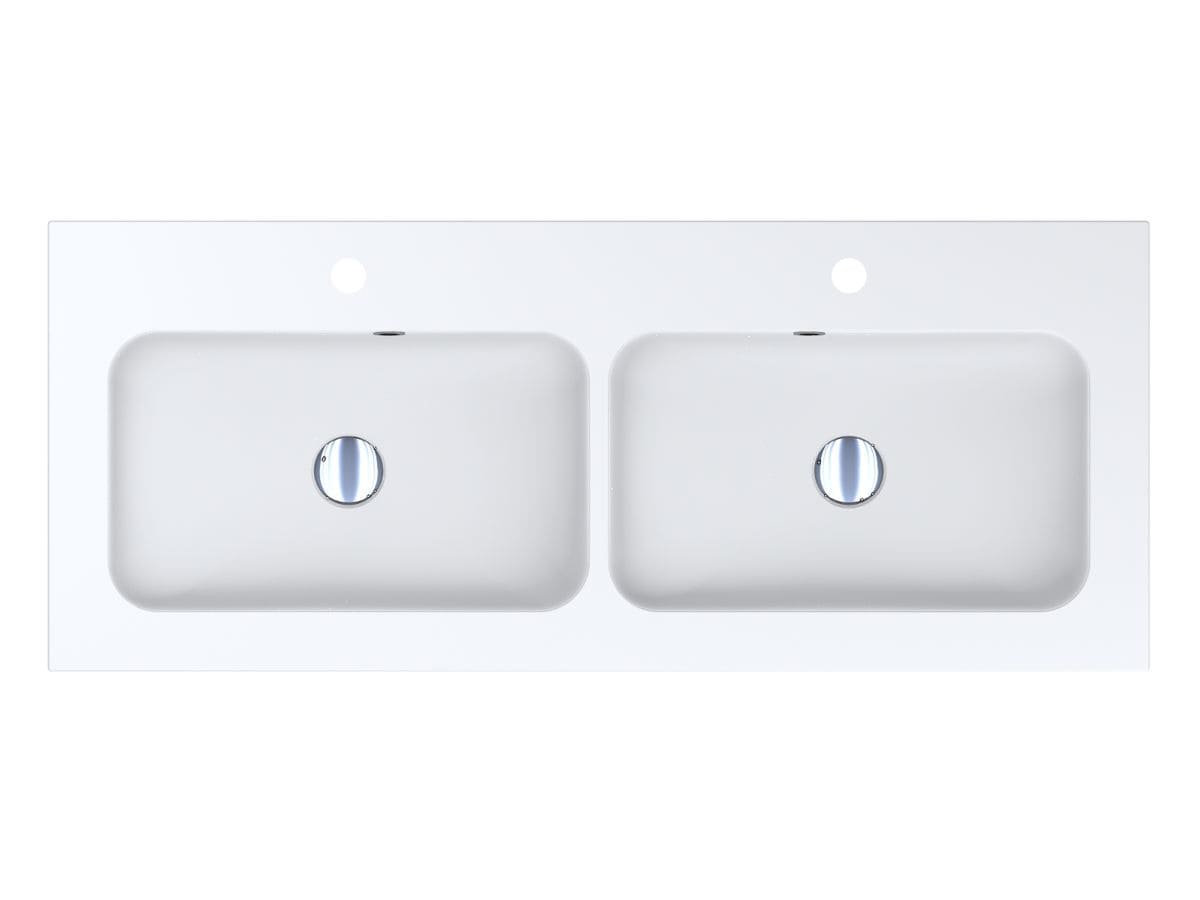 Матовий подвійний умивальник на тумбу DELLA 1100-2 MIRASOFT з прямокутними чашами - чудове рішення для великої родини. Широкі крила дозволяють комфортно розташувати банне приладдя та проводити гігієнічні процедури вдвох. Раковина має два отвори під змішувач та переливи у кожній чаші. Умивальник може бути встановлений накладним методом на тумбу або врізаний у полицю.
