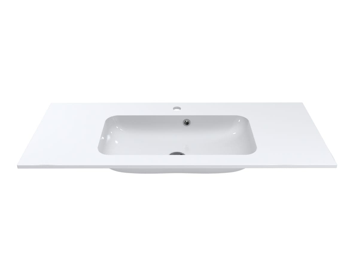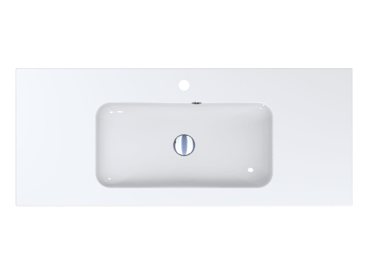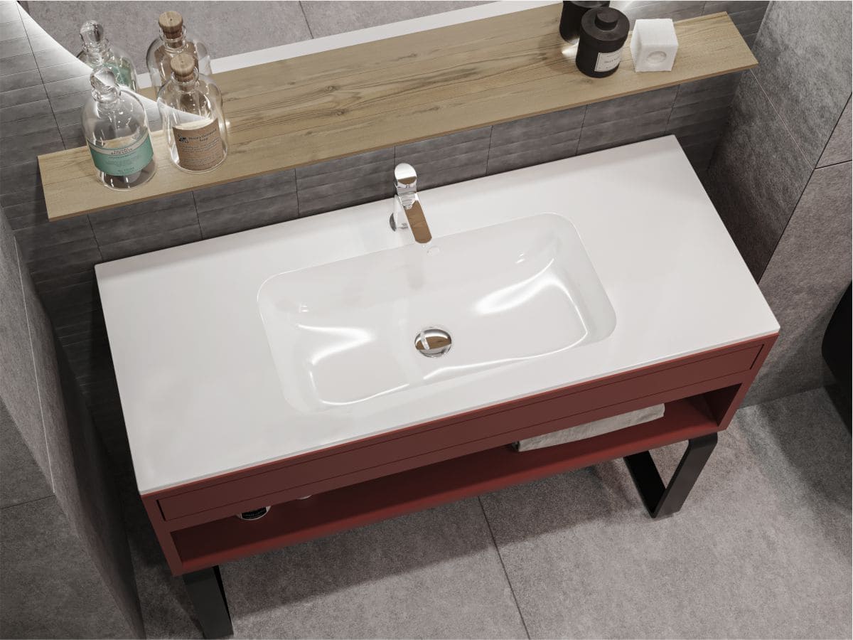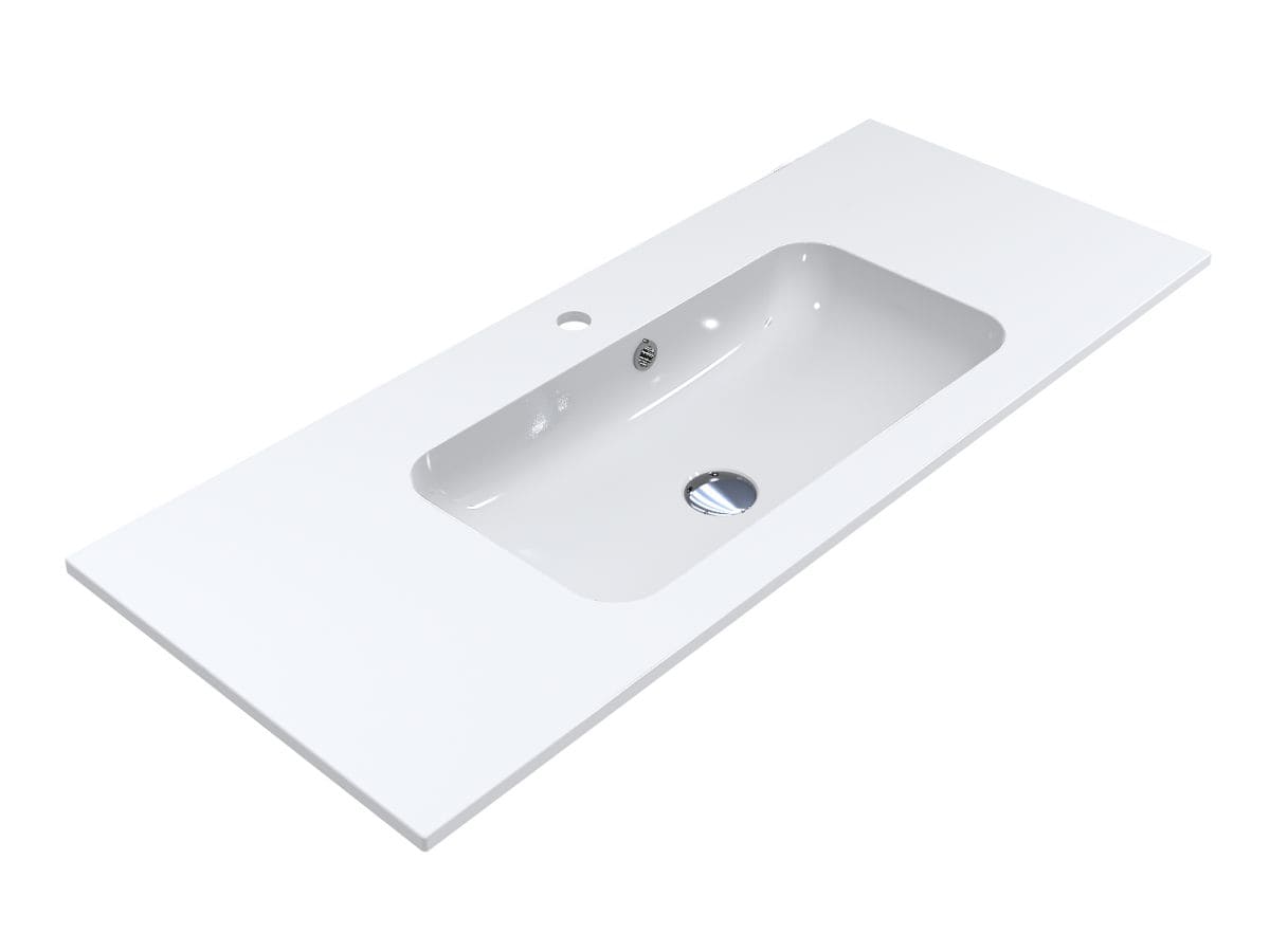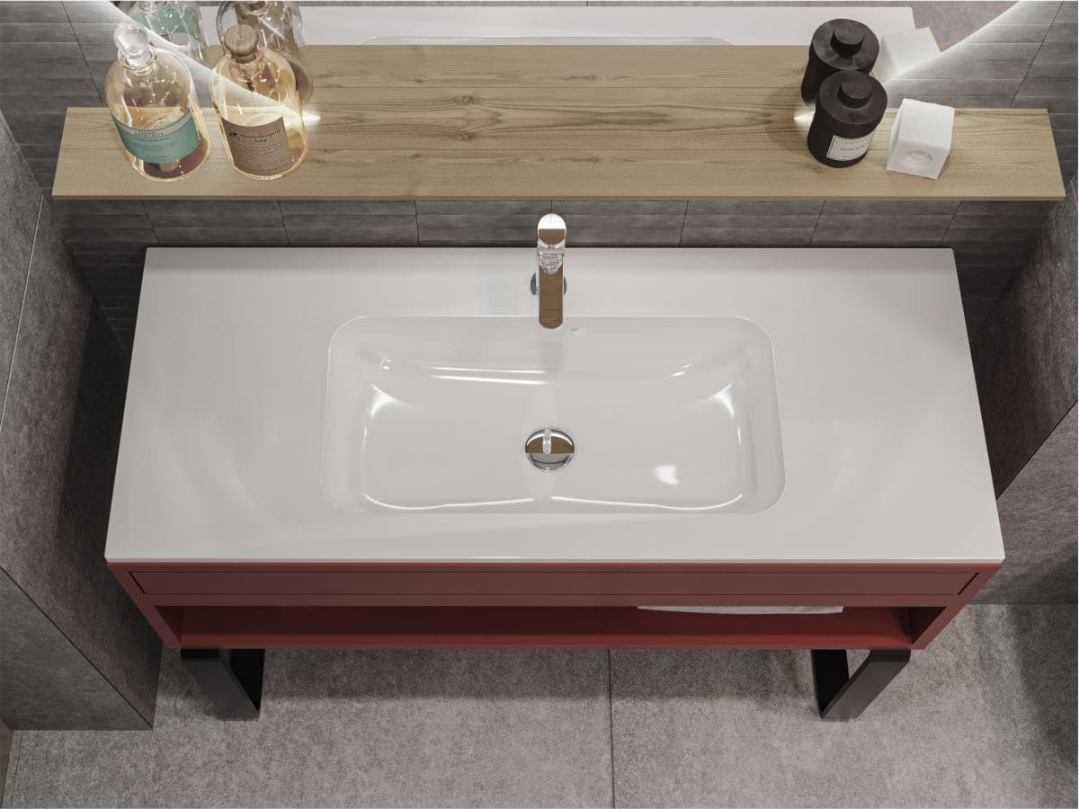 Умивальник із литого мармуру на тумбу DELLA 1100 із прямокутною чашею - відмінне рішення для великих ванних кімнат. Широкі крила з обох боків чаші дозволяють розташувати банне приладдя. Раковина має отвори під змішувач та перелив. Умивальник може бути встановлений накладним методом на тумбу або врізаний у полицю.