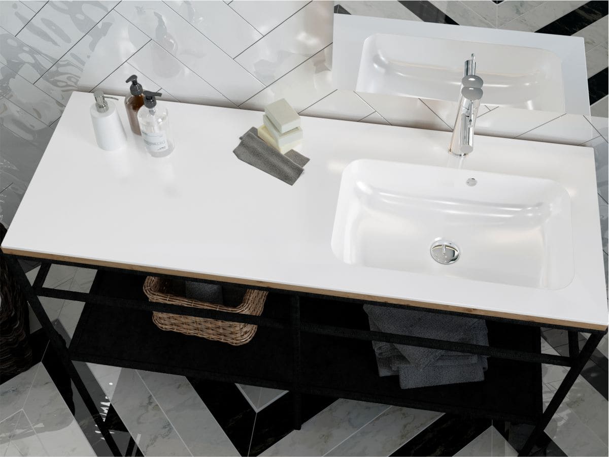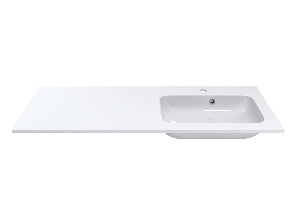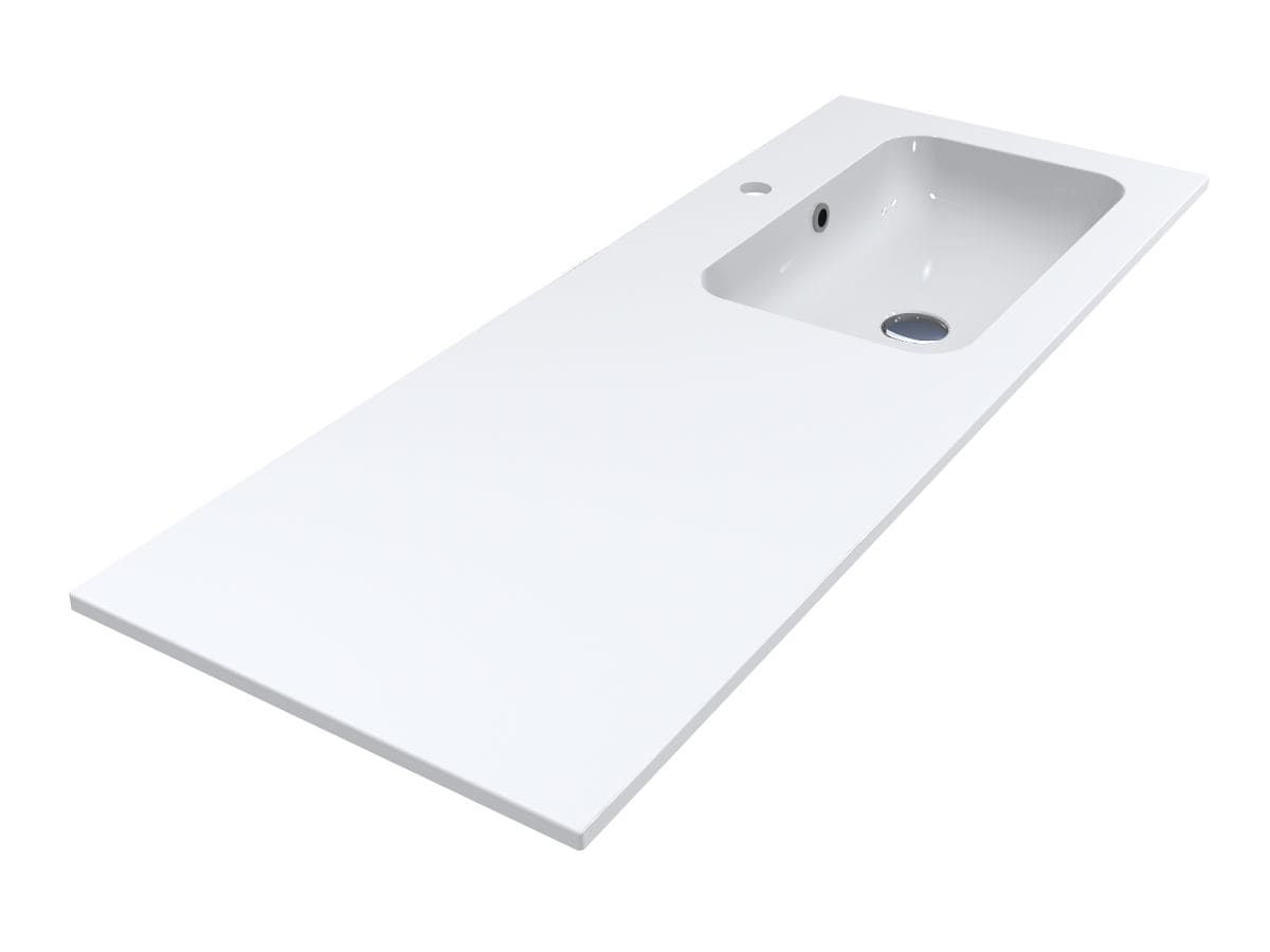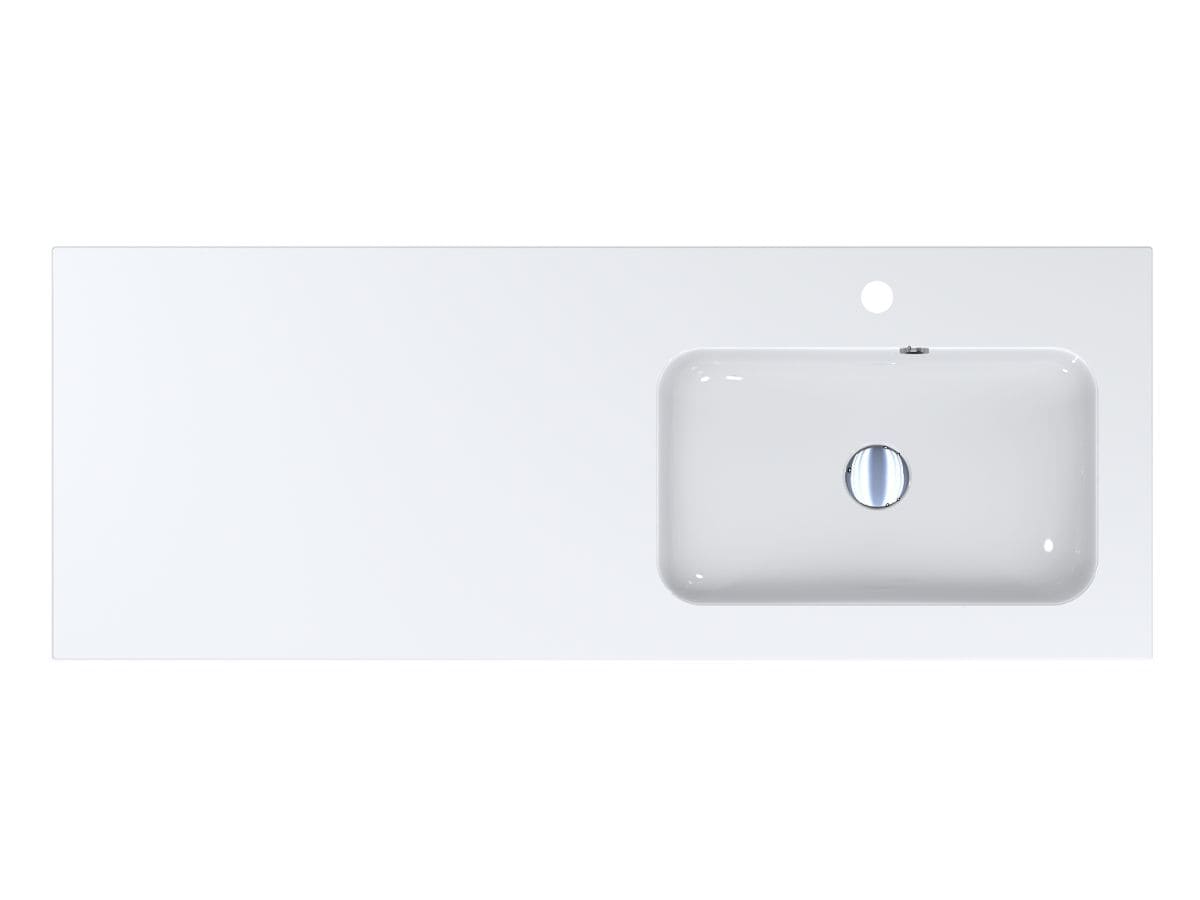 Умивальник із литого мармуру з крилом ліворуч DELLA 1200 R - оригінальне та комфортне рішення, якщо Ви переважно користуєтеся лівою рукою! Прямокутна чаша зміщена праворуч, що дозволяє розташувати під крилом пральну машину або тумбу. Раковина має отвір під змішувач та перелив. Умивальник може бути встановлений накладним методом на тумбу або врізаний у полицю.