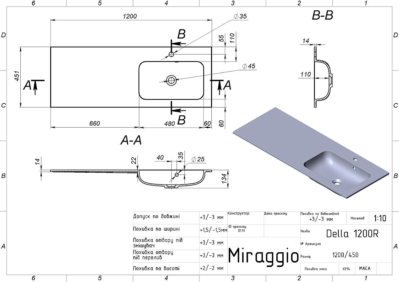 Заводський стандарт моделі DELLA 1200 R передбачає отвори під змішувач та перелив. Опціонально можна замовити умивальник з одним із них або зовсім без отворів. Додатково донний клік-клак можна замовити на сайті.