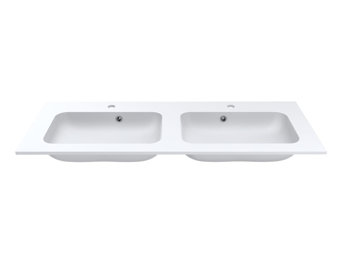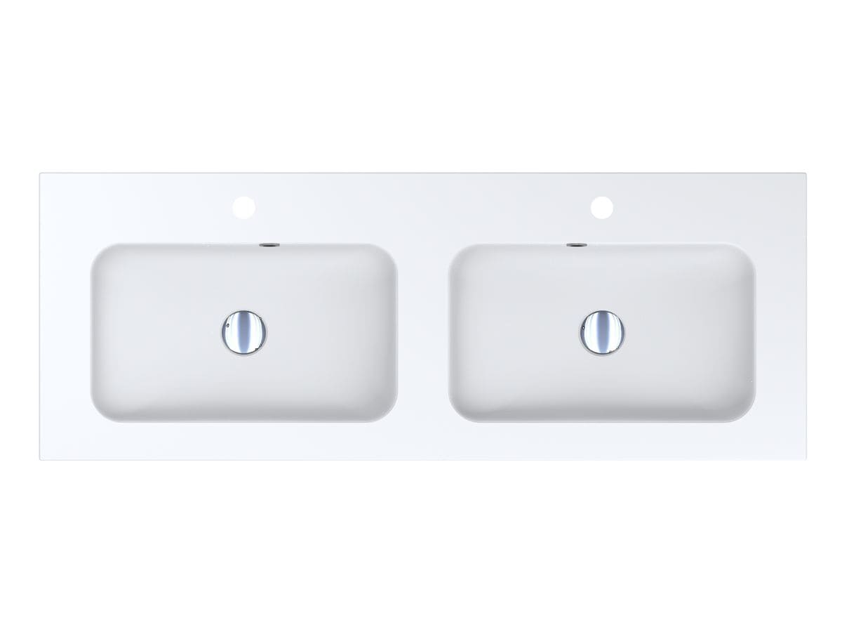 Матовий подвійний умивальник на тумбу DELLA 1200-2 MIRASOFT з прямокутними чашами - чудове рішення для великої родини. Широкі крила дозволяють комфортно розташувати банне приладдя та проводити гігієнічні процедури вдвох. Раковина має два отвори під змішувач та переливи у кожній чаші. Умивальник може бути встановлений накладним методом на тумбу або врізаний у полицю.