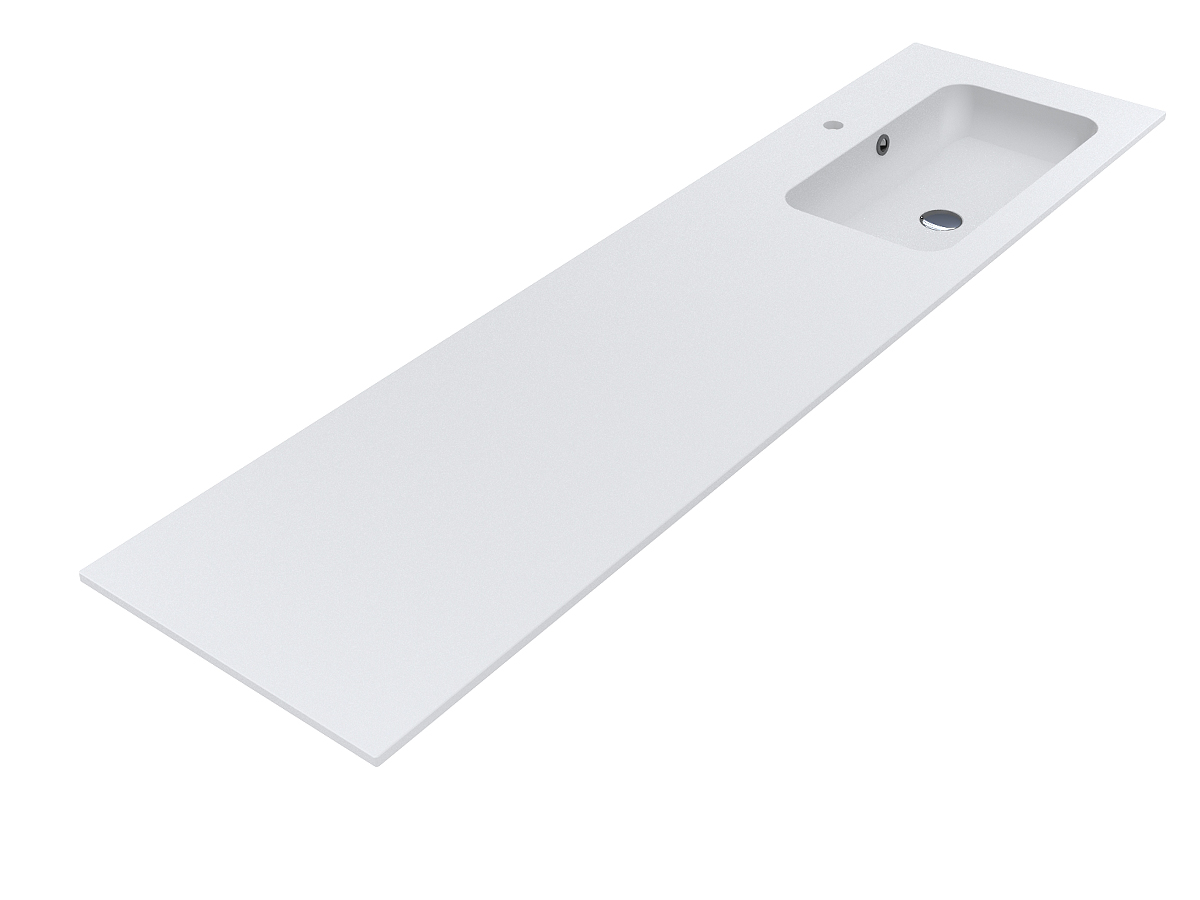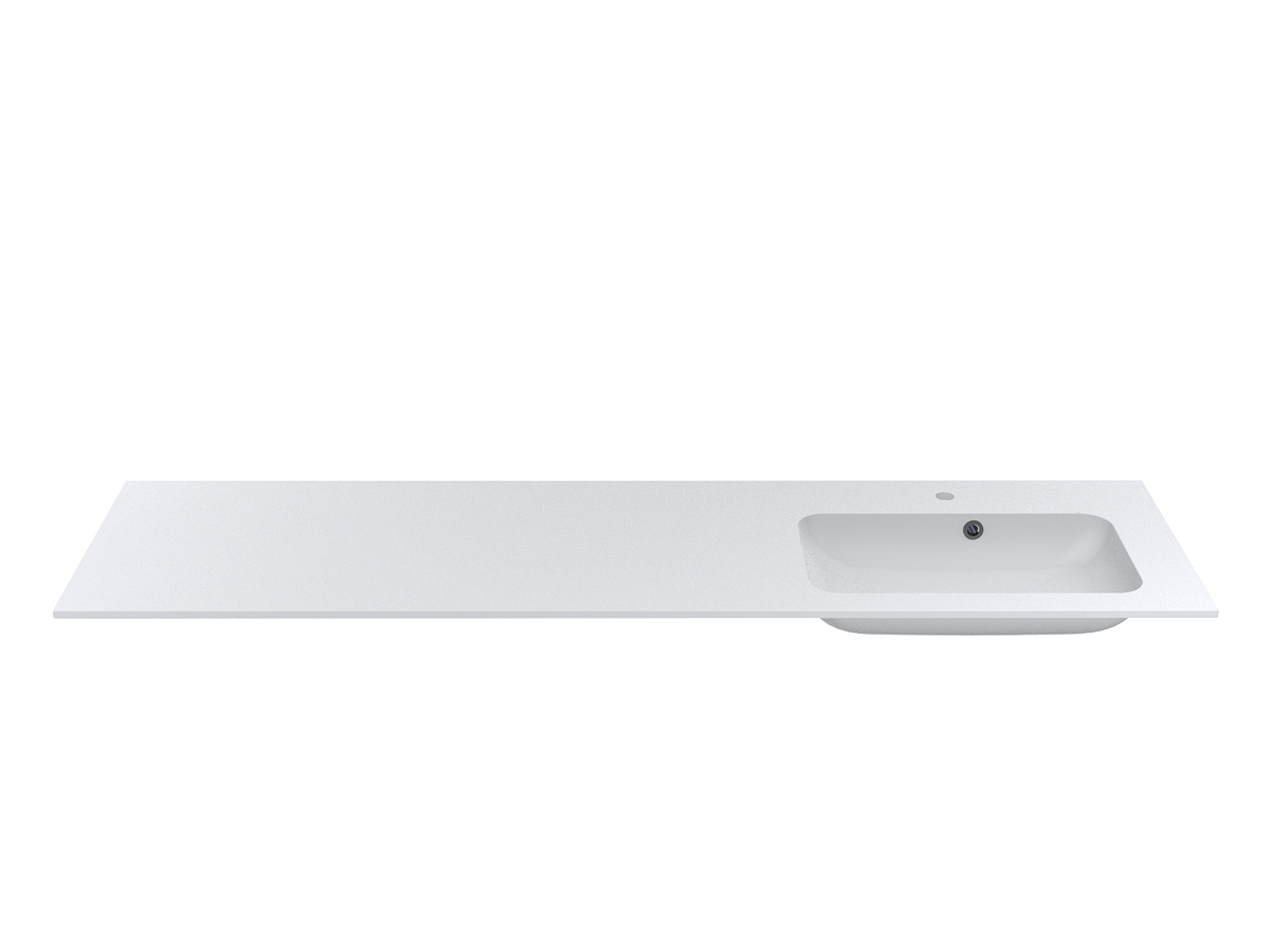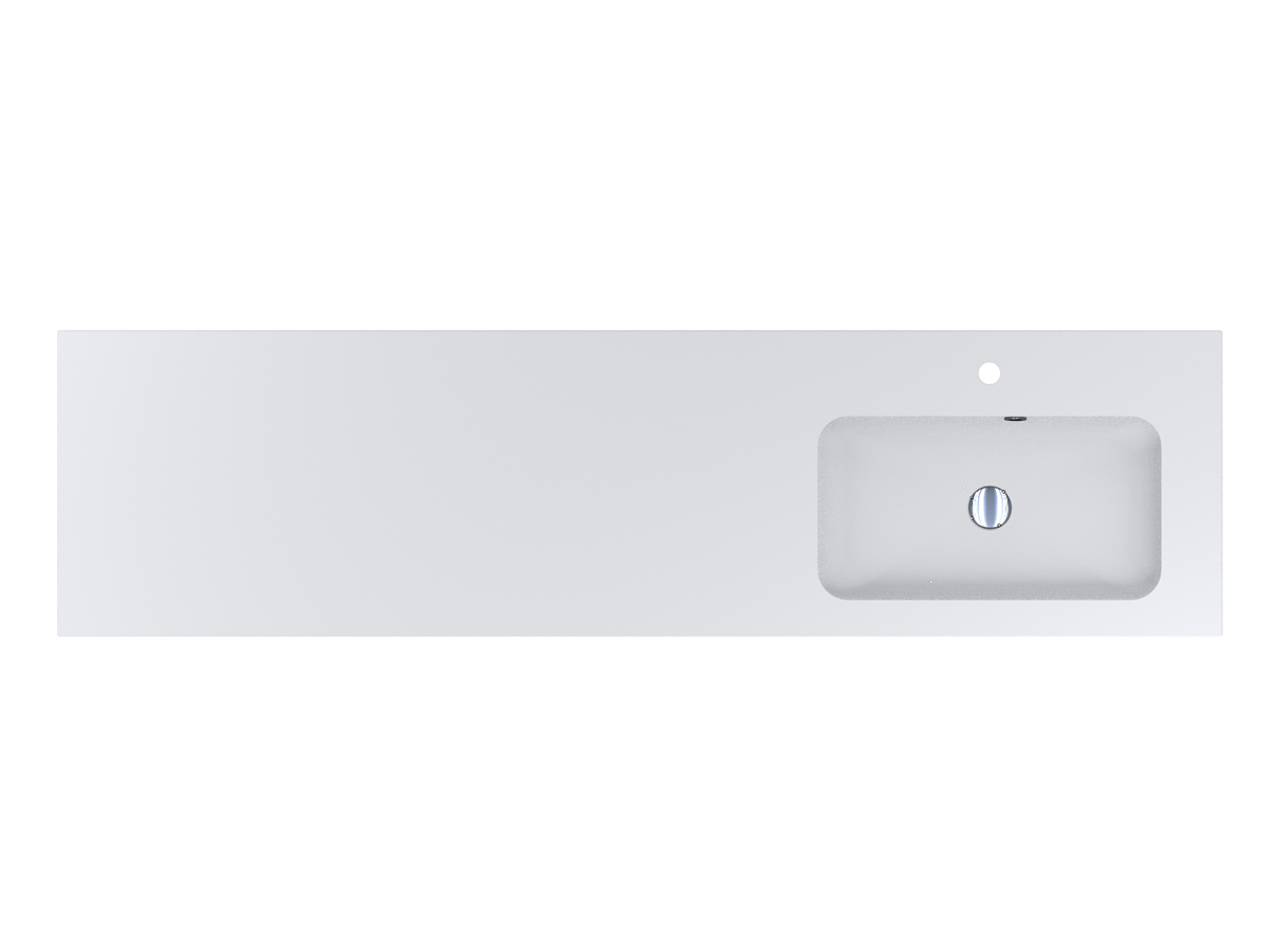 Матовий умивальник Della 1900 R від MIRAGGIO з прямокутною чашею з правого боку стане бездоганним місцем для ранкових ритуалів у Вашій ванній кімнаті. Чаша умивальника з чіткими контурами має стильний та лаконічний вигляд. Широке бічне крило дає можливість розмістити під ним пральну машину або комод з шухлядами довільної ширини, а зверху залишається багато місця для косметики та аксесуарів. Умивальник може бути встановлений накладним методом на тумбу, що дозволяє адаптувати його до будь-якого дизайну ванної кімнати. Максимальна ширина умивальника становить 1900 мм, додатково її можна обрізати під індивідуальні розміри. Якщо дизайн-проєкт передбачає змішувачі прихованого монтажу, виготовимо умивальник без отворів під змішувач та/або перелив. Поєднання умивальника та стільниці забезпечує гармонійний вигляд інтер’єру ванної кімнати, додаючи відчуття завершеності.