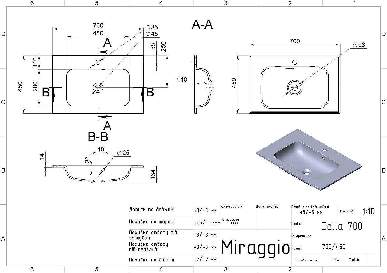 Заводський стандарт моделі DELLA 700 передбачає отвори під змішувач та перелив. Опціонально можна замовити умивальник з одним із них або зовсім без отворів. Додатково донний клік-клак можна замовити на сайті.