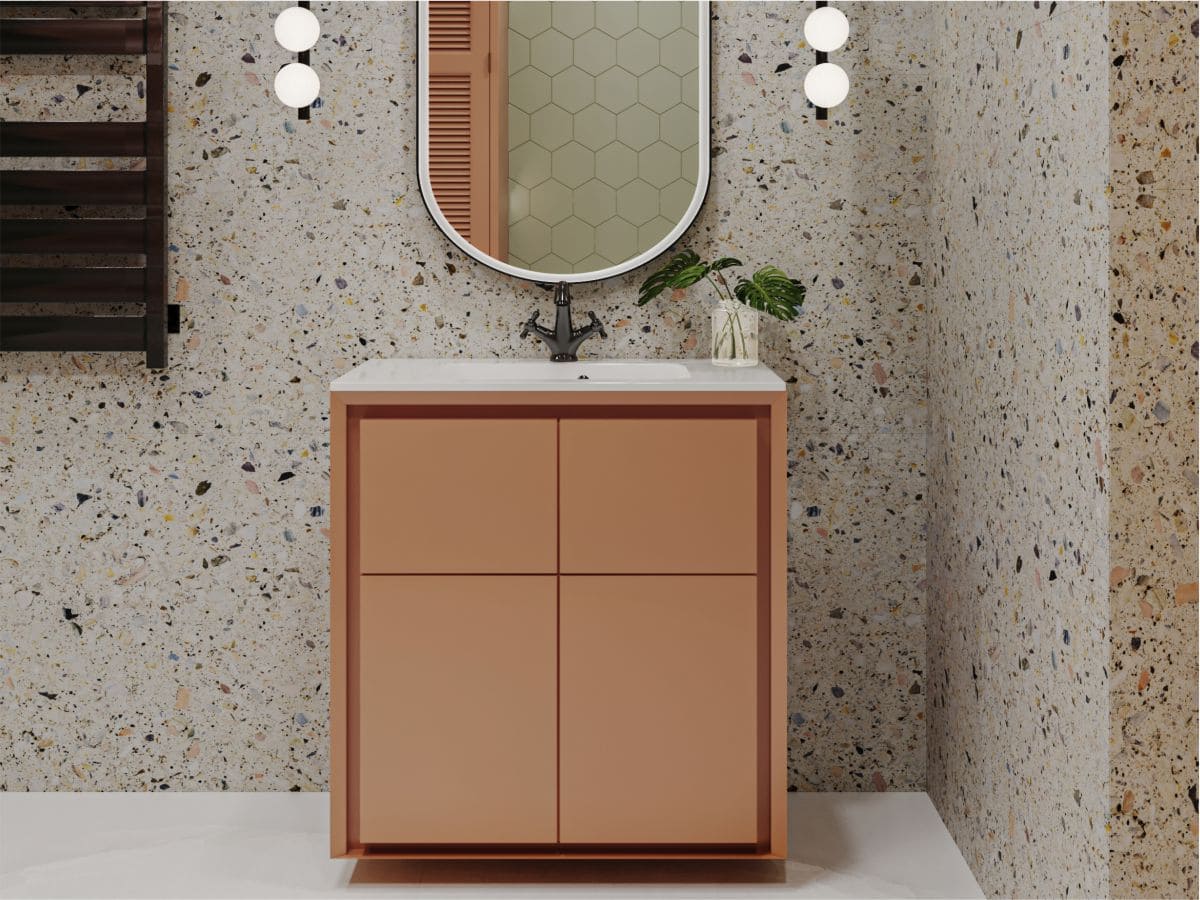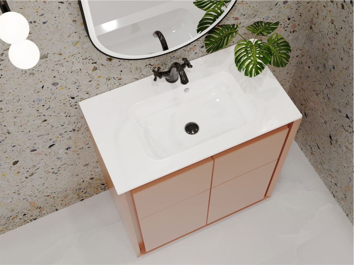 Компактний умивальник із литого мармуру DELLA 800 із прямокутною чашею та крилами середньої ширини – оптимальне рішення для маленької ванної кімнати. Має отвори під змішувач та перелив. Раковина може бути накладена на тумбу, що також передбачає врізний спосіб монтажу.