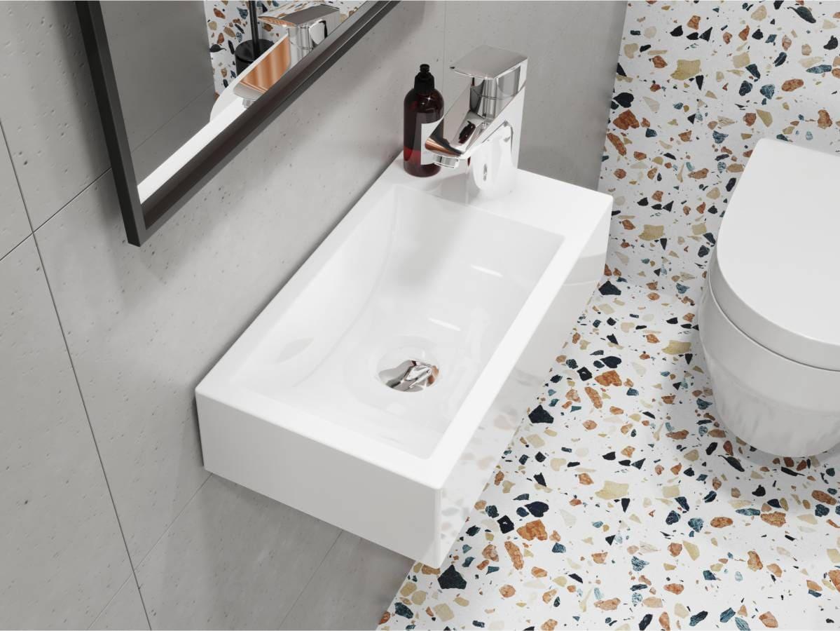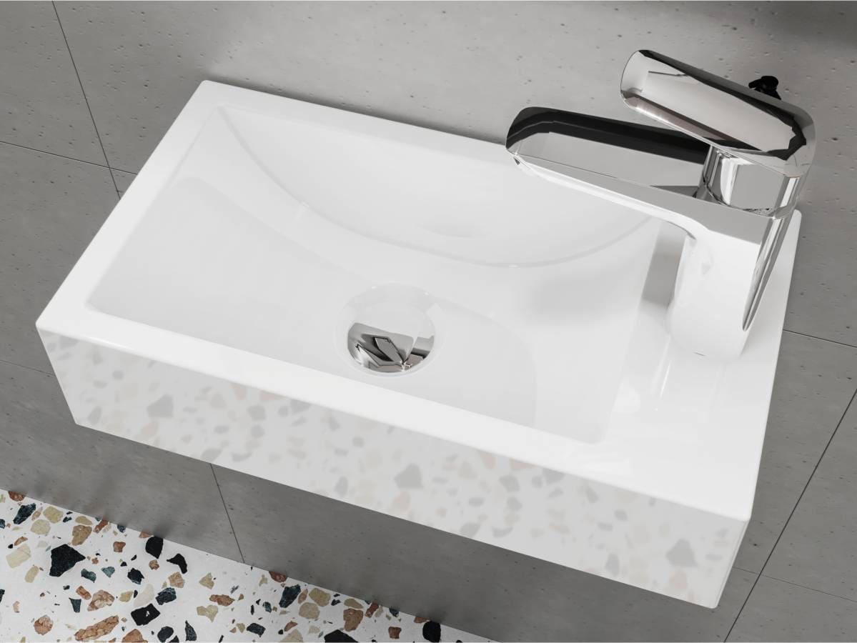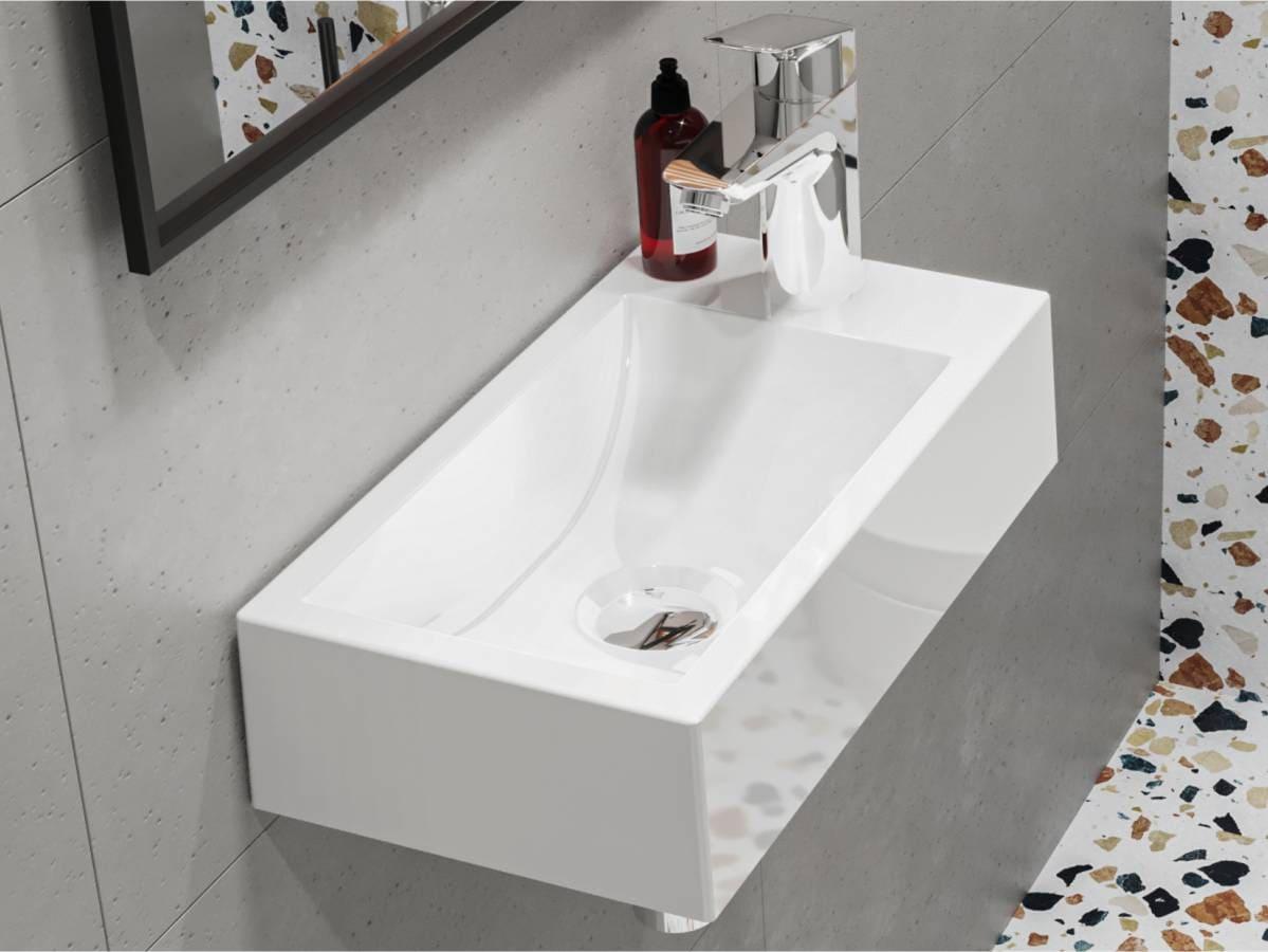 Умивальник із литого мармуру FARO L прямокутної форми - функціональний аксесуар для невеликої ванної кімнати в класичному, сучасному або стилі мінімалізм. Оптимальне рішення для організації простору завдяки можливості встановити змішувач на крилі праворуч від чаші. Умивальник має підвісний тип монтажу.