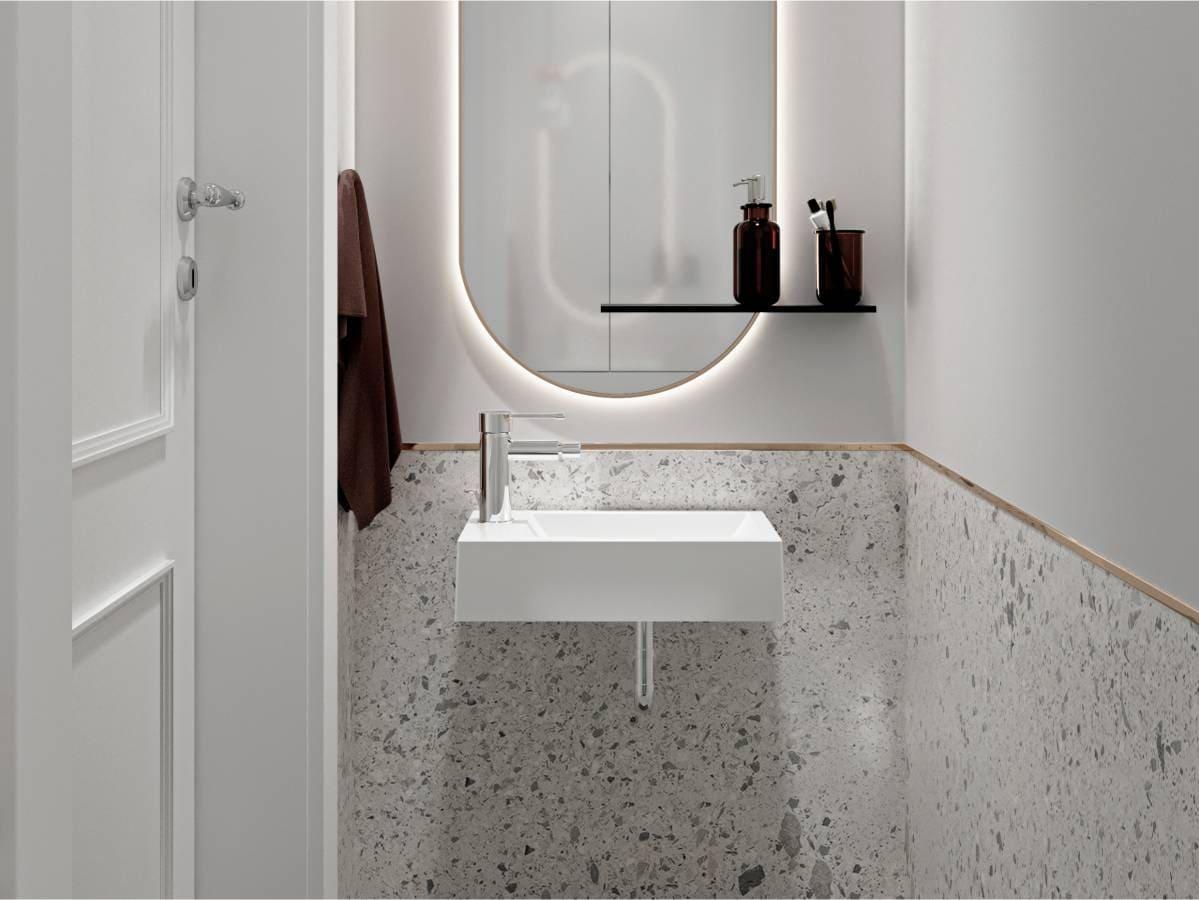 Умивальник FARO R також може бути виготовлений в технологіях MIRAMARBLE MATT, MIRASOFT і MIRASTONE (в сірому або чорному кольорі).
