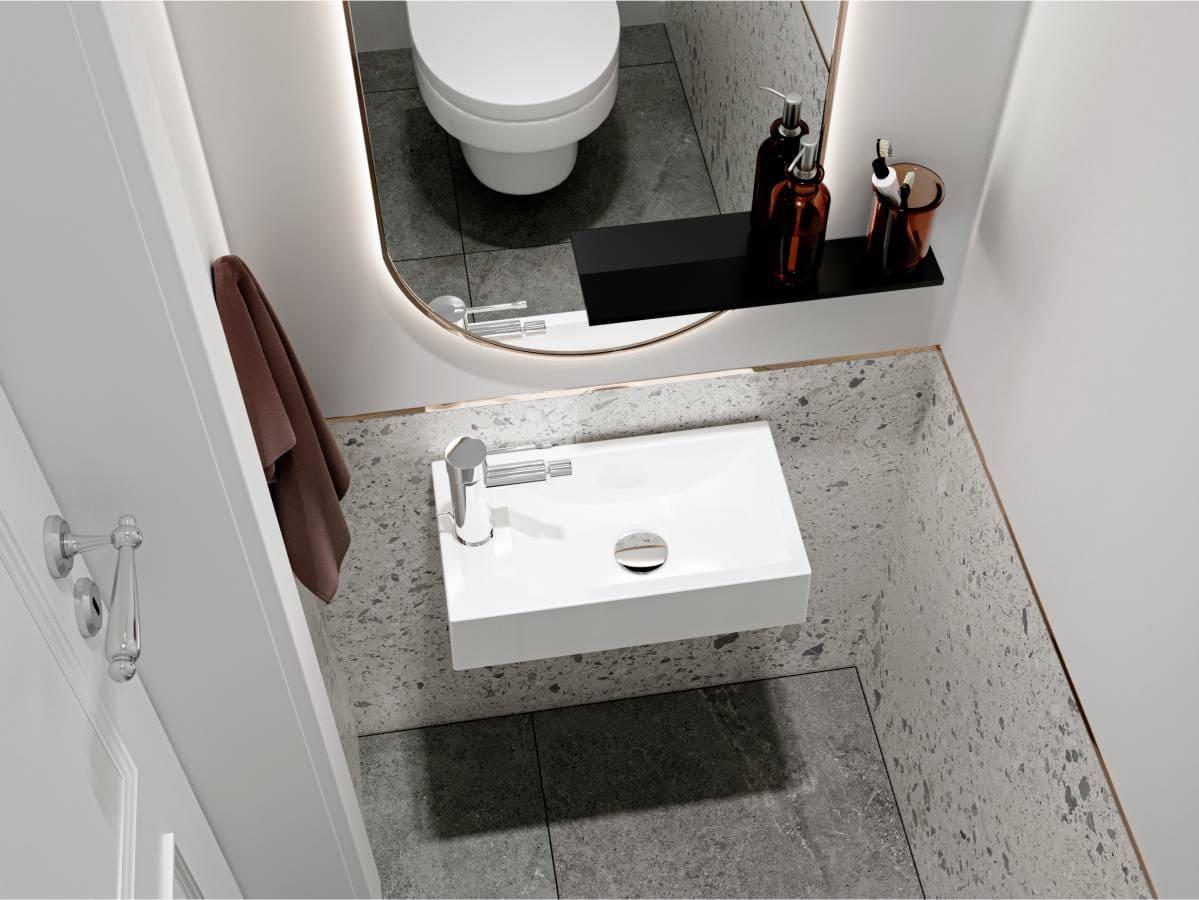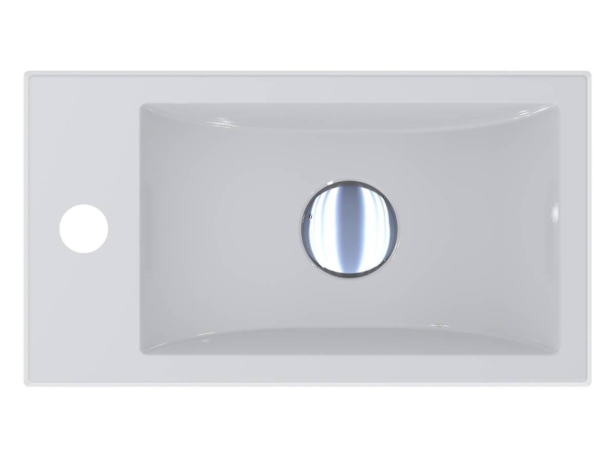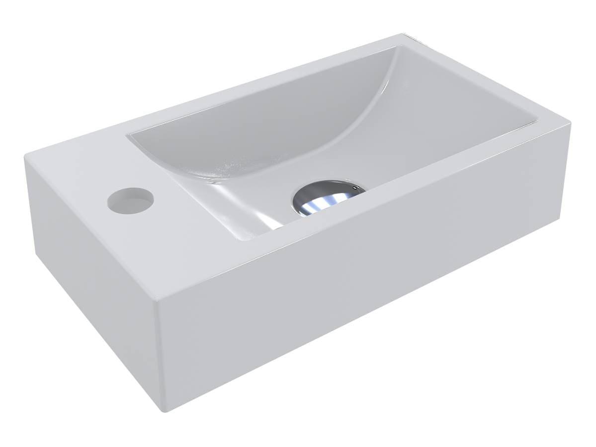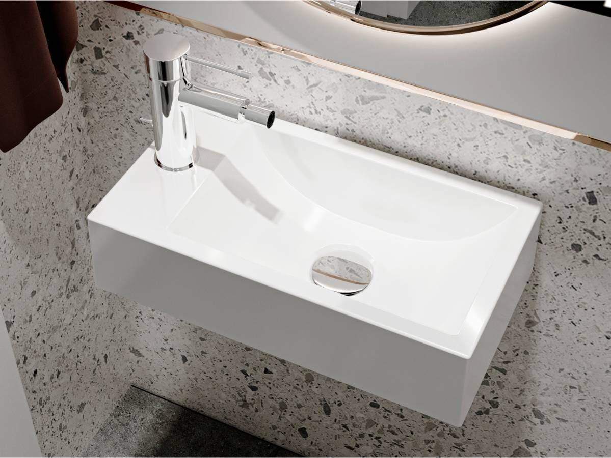 Умивальник із литого мармуру FARO R прямокутної форми - функціональний аксесуар для невеликої ванної кімнати в класичному, сучасному або стилі мінімалізм. Оптимальне рішення для організації простору завдяки можливості встановити змішувач на крилі ліворуч від чаші. Умивальник має підвісний тип монтажу.