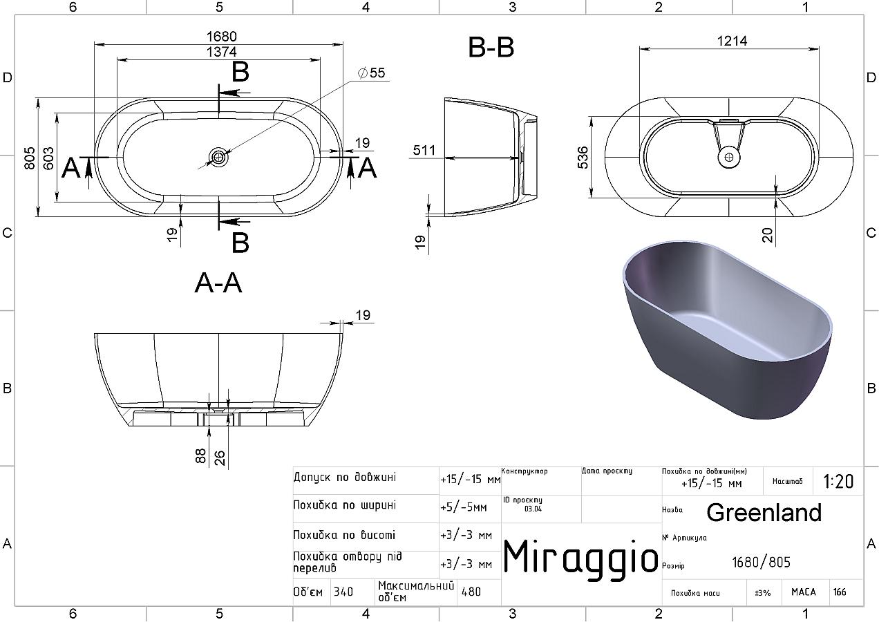 Розміри ванни GREENLAND 1680х805 мм роблять її універсальним виробом для ванних кімнат різної площі, а місткість 480 л дозволяє насолодитись процесом купання максимально. Вага ванни 166 кг. Немає отвору під перелив. Додатково можна замовити отвір під ревізію та кольорове покриття зовнішньої стінки ванни за палітрою RAL.