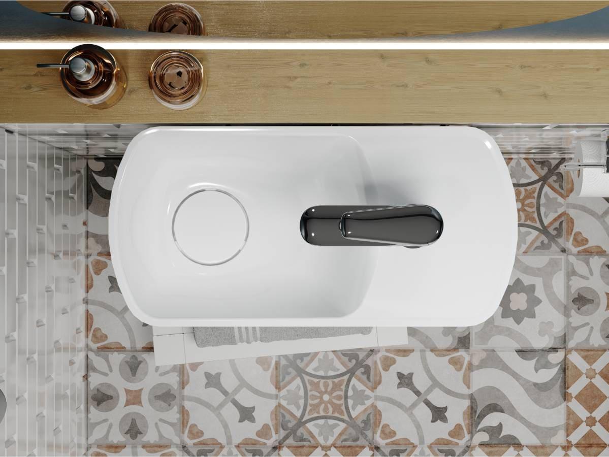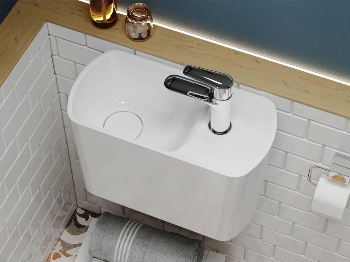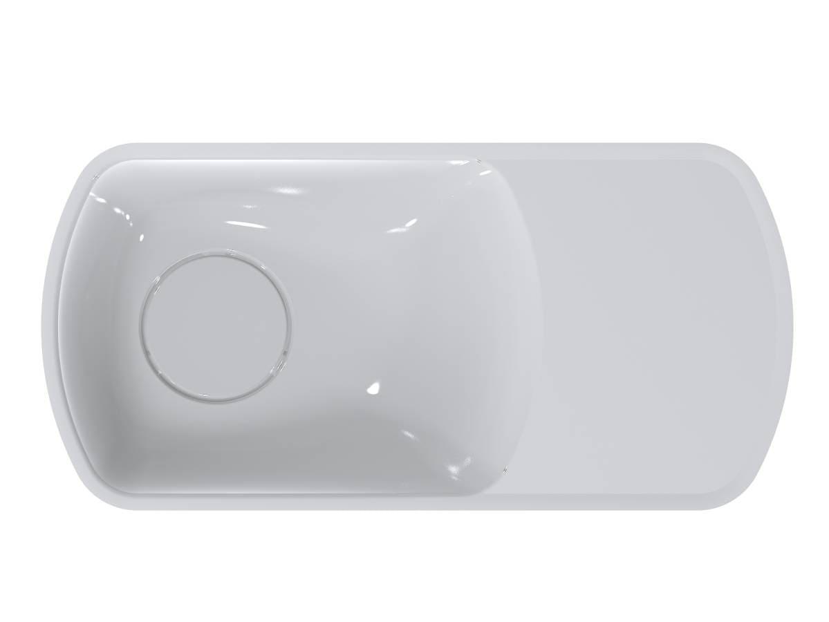 Компактний умивальник з литого мармуру HELIX L – ідеальне рішення для маленької ванної кімнати. Зручна чаша зліва, отвір під змішувач і невелике крило для гігієнічних речей, всі комунікації приховані в корпусі. Завдяки оригінальній формі він ніколи не залишиться поза увагою! Умивальник має підвісний тип монтажу. Отвір під слив прихований декоративною накладкою.