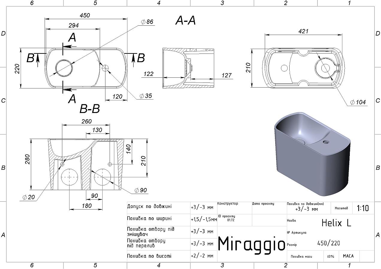 Сантехніка MIRAGGIO виробляється за авторською технологією змішування мармуровою крихти та поліефірної смоли в вакуумі. Матеріал умивальника - MIRAMARBLE. В його структурі відсутні мікропори, що виключає розвиток бактерій в товщі стінок. Додатково виріб покритий антибактеріальним гелем. Поверхня умивальника глянцева.