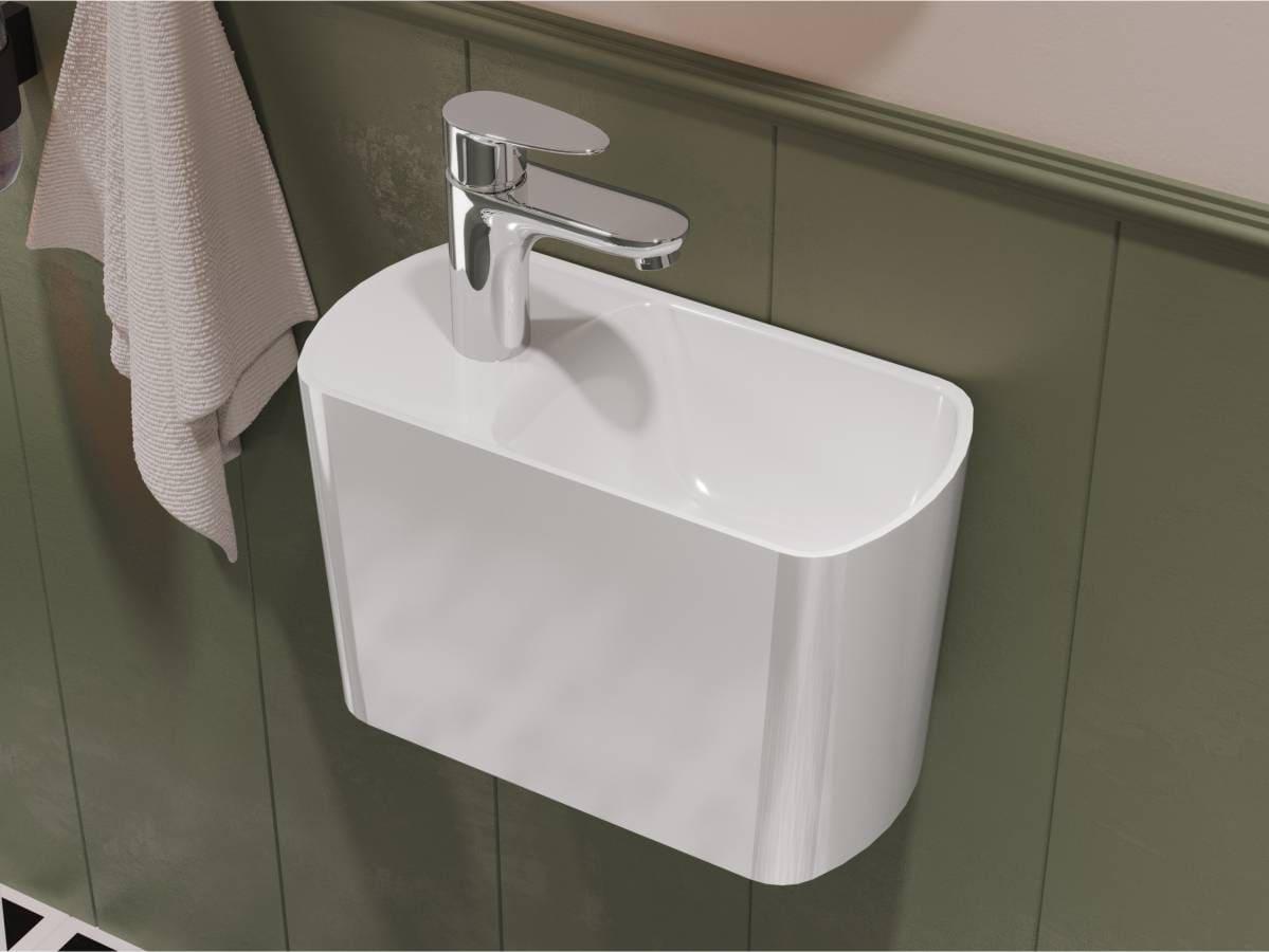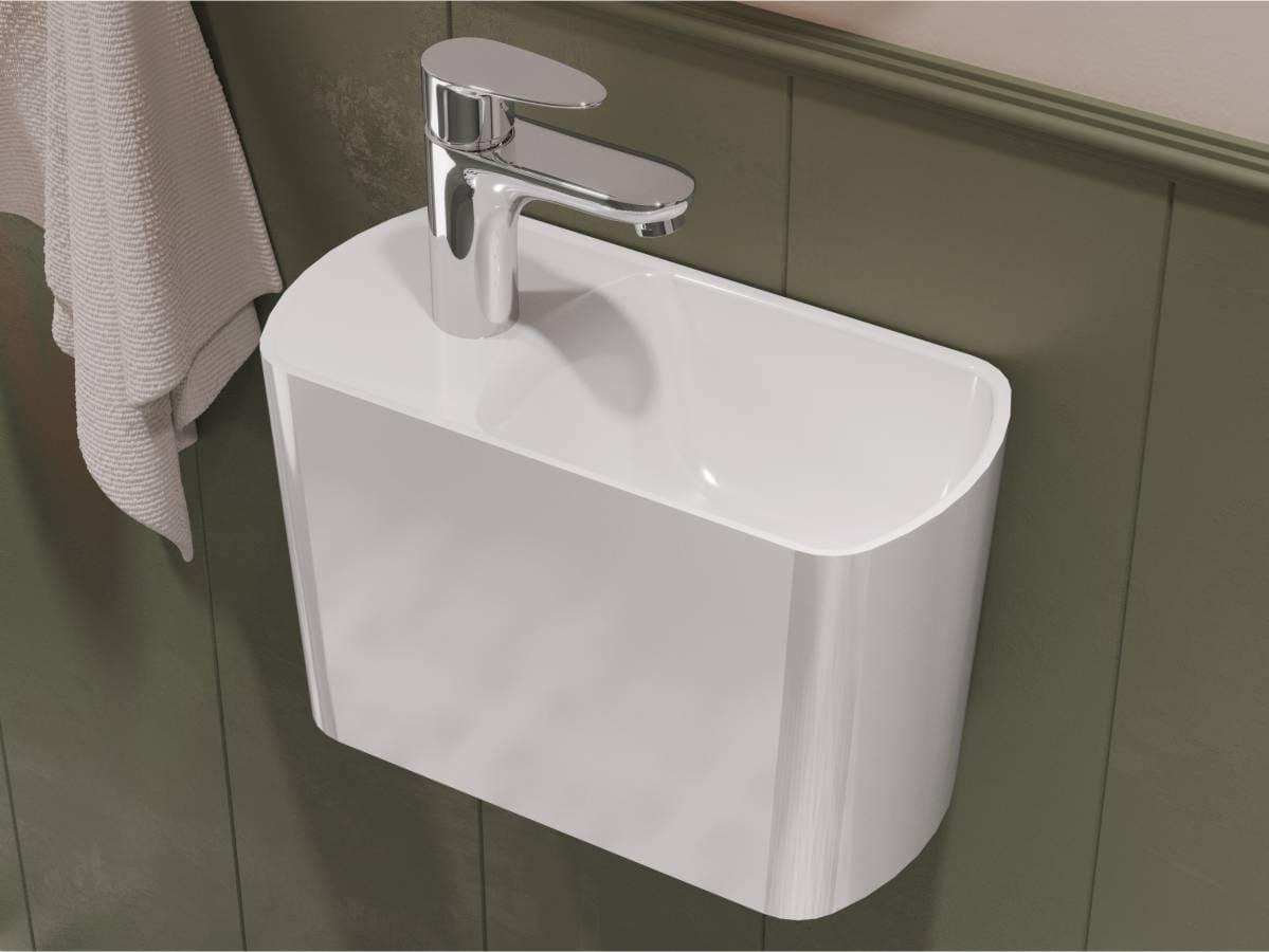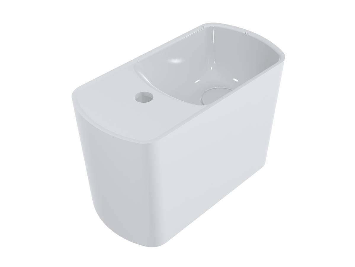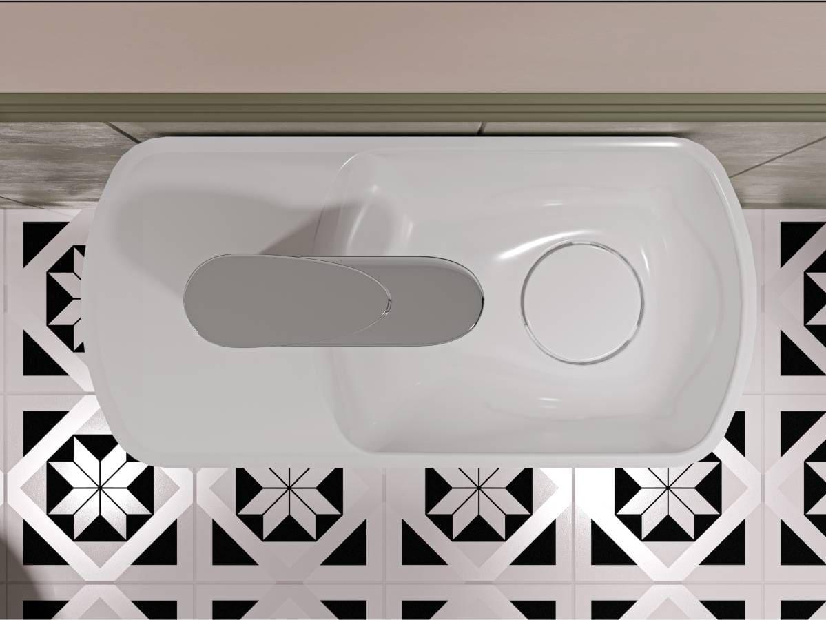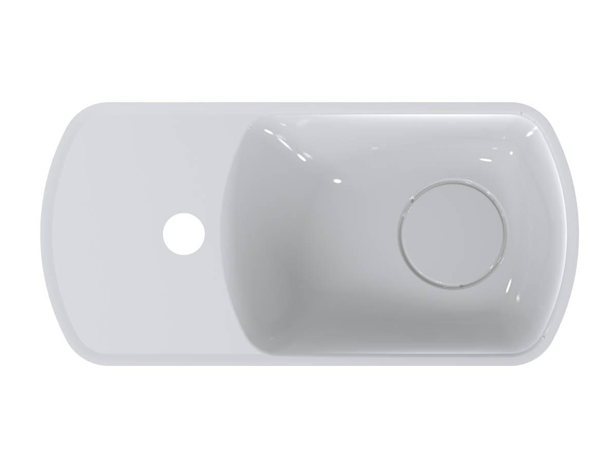 Компактний умивальник з литого мармуру HELIX R – ідеальне рішення для маленької ванної кімнати. Зручна чаша праворуч, отвір під змішувач і невелике крило для гігієнічних речей, всі комунікації приховані в корпусі. Завдяки оригінальній формі він ніколи не залишиться поза увагою! Умивальник має підвісний тип монтажу. Отвір під слив прихований декоративною накладкою.