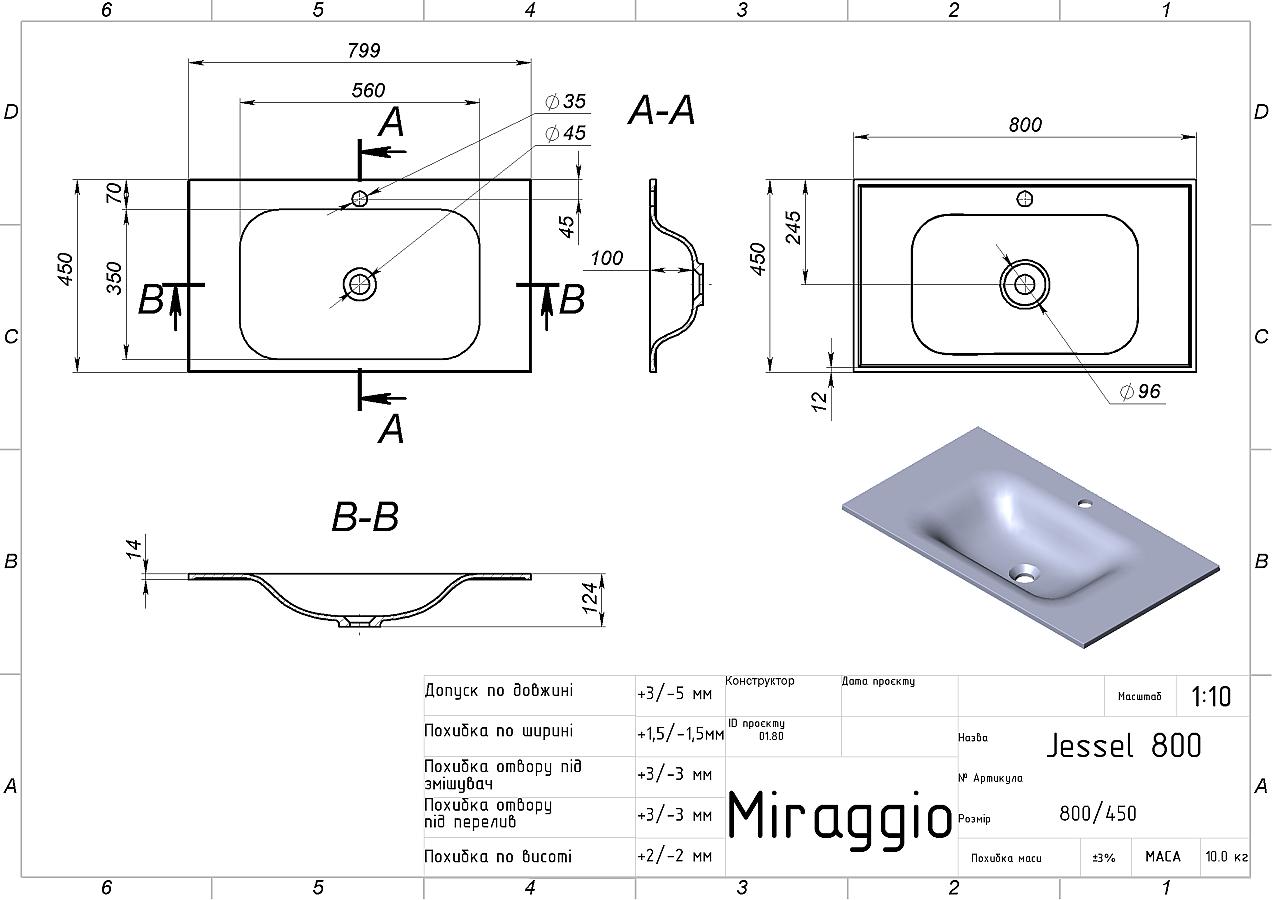 Заводський стандарт моделі JESSEL 800 передбачає отвір під змішувач. Опціонально можна замовити умивальник без отвору. Додатково донний клапан клік-клак можна замовити на сайті.