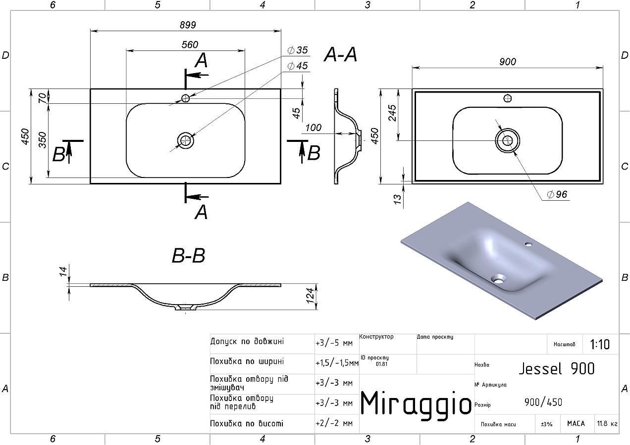 Заводський стандарт моделі JESSEL 900 передбачає отвір під змішувач. Опціонально можна замовити умивальник без отвору. Додатково донний клапан клік-клак JESSEL 900 можна замовити на сайті.