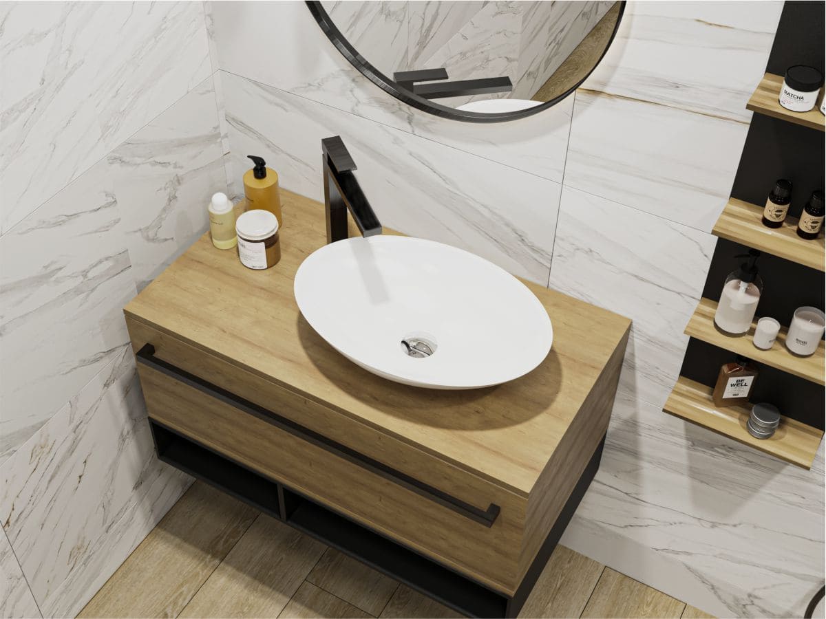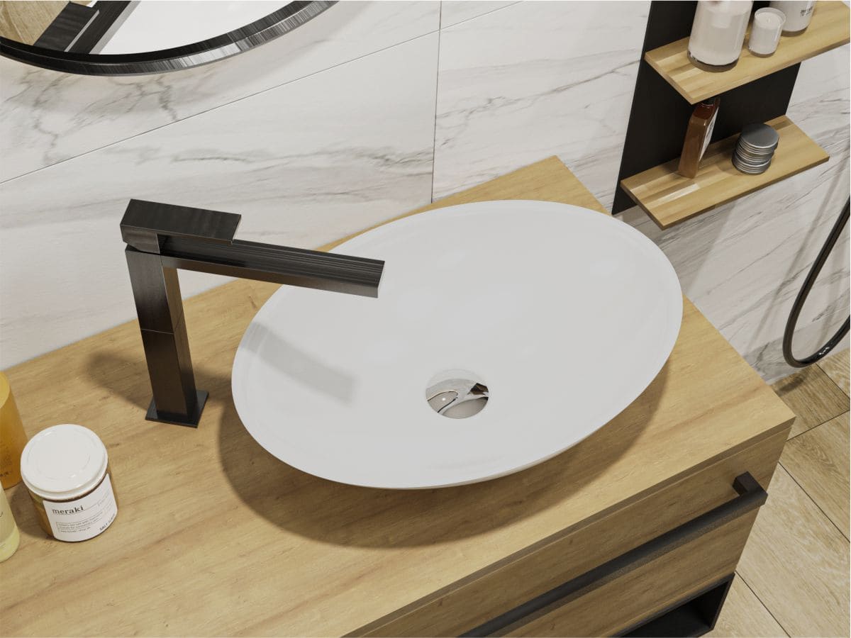Умивальник KRISTINA також може бути виготовлений у технологіях MIRAMARBLE MATT та MIRASOFT.