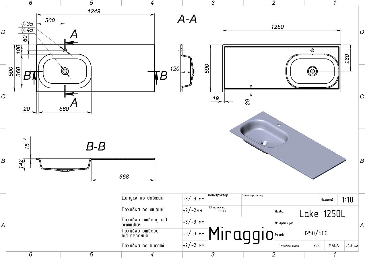 Характеристики Умивальник LAKE 1250 L MIRASOFT