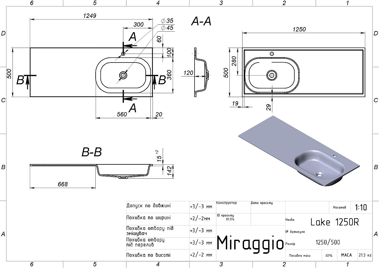 Характеристики Умивальник LAKE 1250 R MIRASOFT
