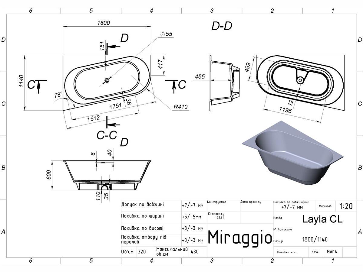 Документація Ванна LAYLA CL асиметрична кутова, лівостороння