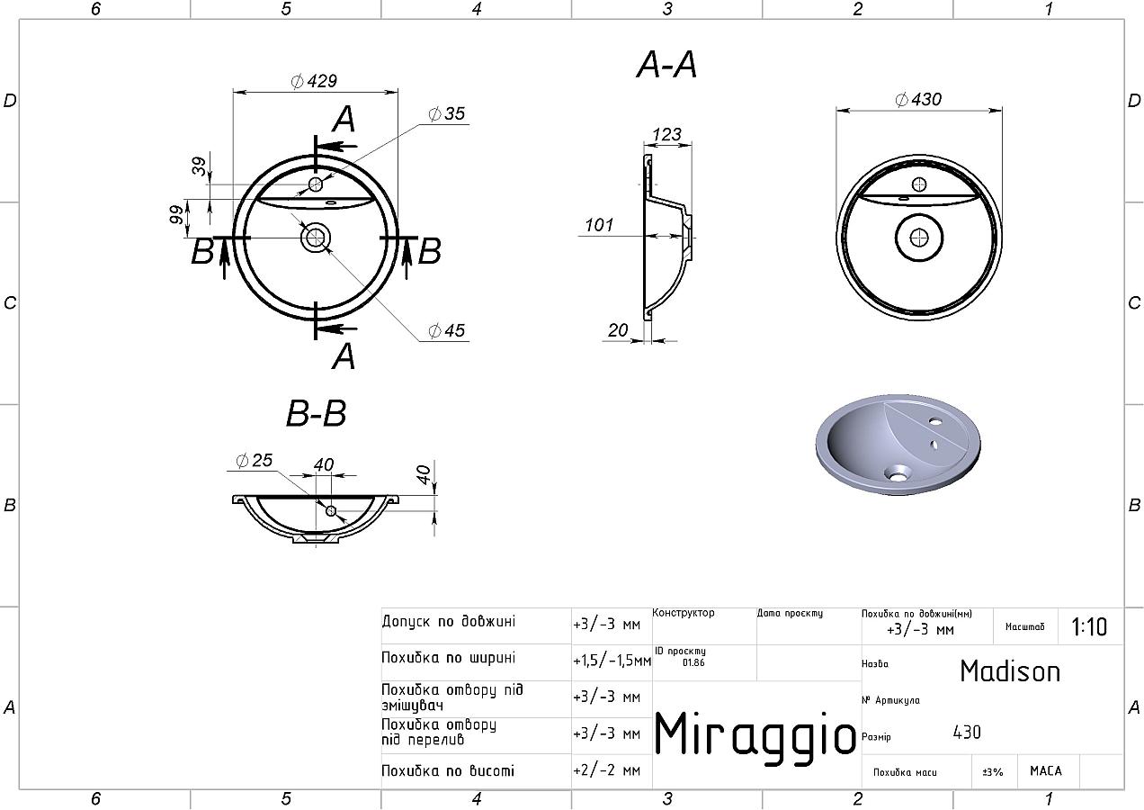 Заводський стандарт моделі MADISON передбачає відчинення під змішувач та перелив. Опційно можна замовити умивальник з одним із них або зовсім без отворів. Додатково донний клапан клік-клак можна замовити на сайті.