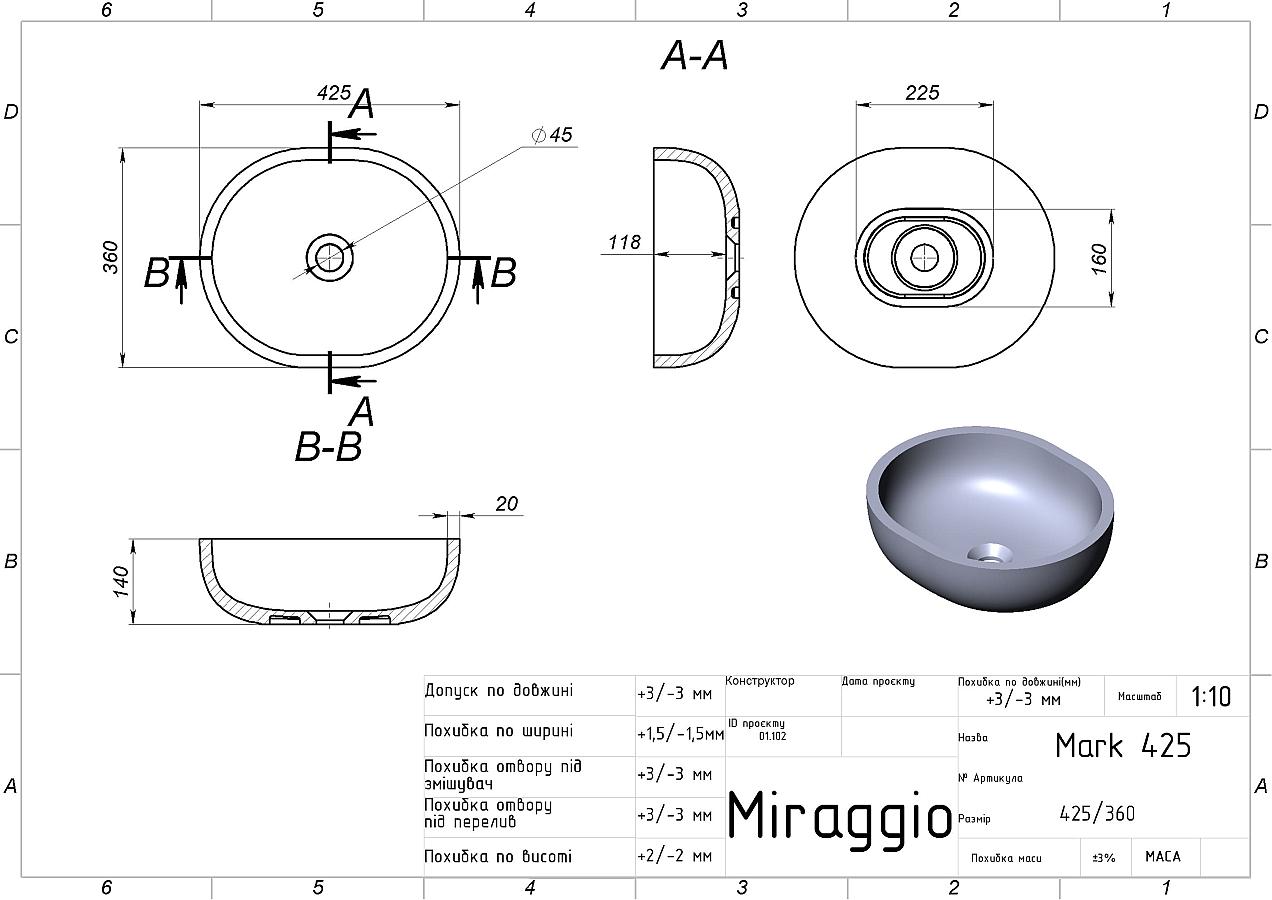 Умивальник MARK 425 також може бути виготовлений у технологіях MIRAMARBLE та MIRAMARBLE MATT.