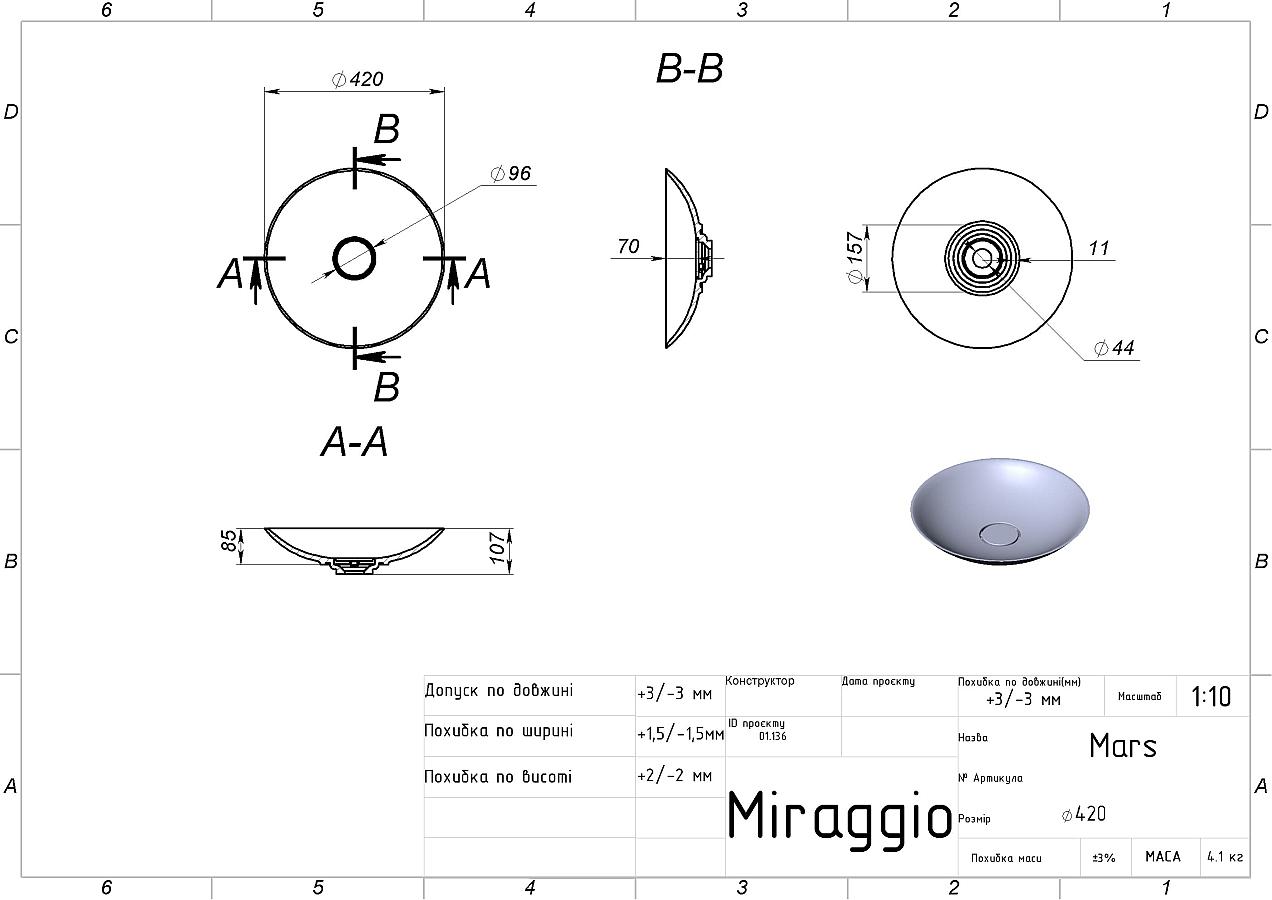Сантехніка MIRAGGIO виробляється за авторською технологією змішування мармуровою крихти та поліефірної смоли в вакуумі. Матеріал умивальника - MIRAMARBLE. В його структурі відсутні мікропори, що виключає розвиток бактерій в товщі стінок. Додатково виріб покритий антибактеріальним гелем. Поверхня умивальника глянцева.