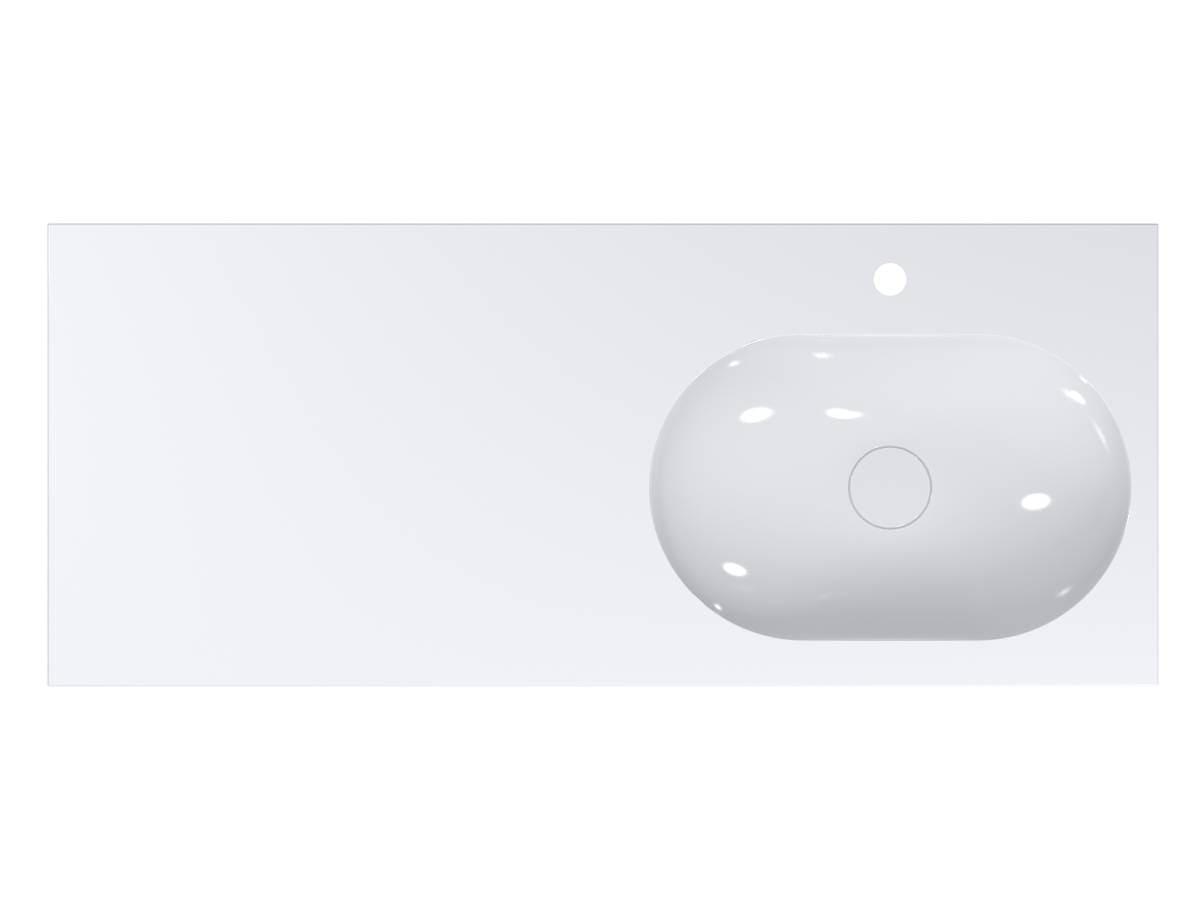 Умивальник з литого мармуру NEW YORK R на тумбу – поєднання краси та комфорту. Модель допомагає ефективно використати простір ванної кімнати. Овальна чаша зміщена праворуч, а широке крило можна використовувати як стільницю. Під крилом зручно розмістити пральну машинку чи комод. Має накладний тип монтажу. Отвір під злив прихований декоративною накладкою.
