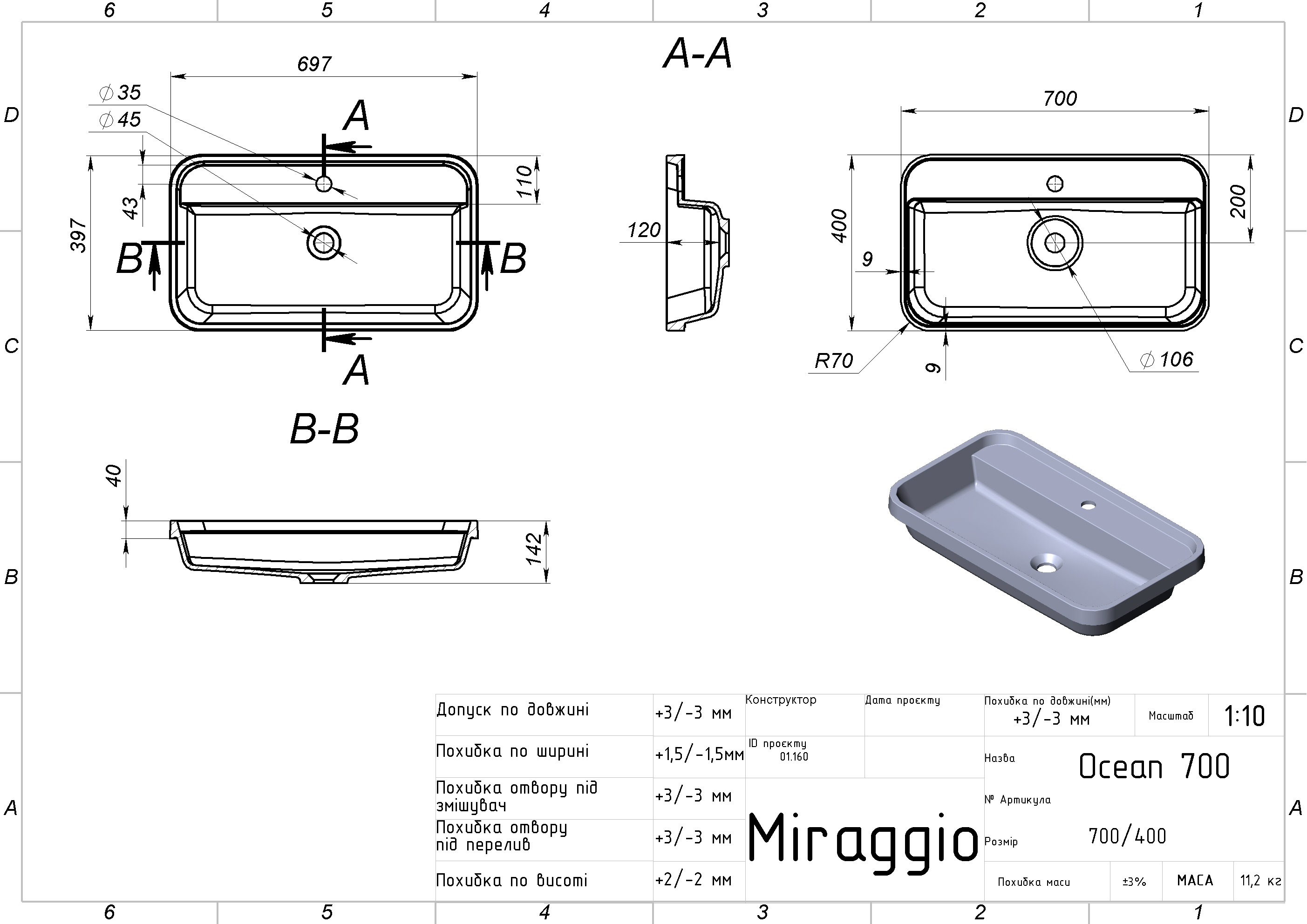 Умивальник Ocean, виготовлений за авторською технологією Miramarble, що передбачає поєднання мармурової крихти з поліефірною смолою. На поверхні умивальника відсутні мікропори, що унеможливлює розвиток бактерій в товщі стінок. Матеріал, з якого виготовляється умивальник, поглинає звуки води, забезпечуючи тишу і комфорт під час використання. Сантехніка покривається додатково антибактеріальним білим гелем та полірується до бездоганного блиску.
