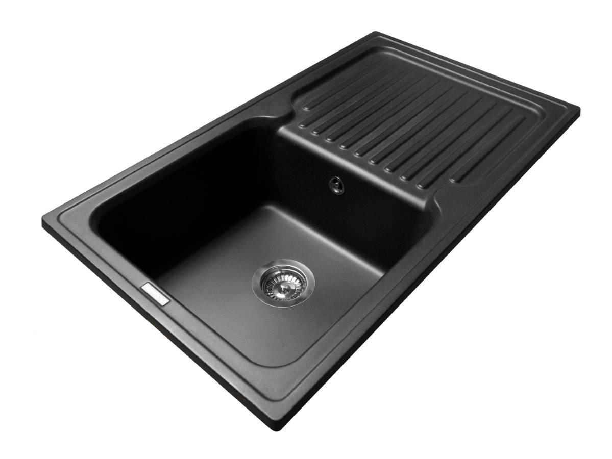 Чорна прямокутна кухонна мийка з кварцового піску ORLEAN має практичний дизайн із глибокою чашею та ребристим неслизьким крилом для посуду. Мийка має врізний тип монтажу.