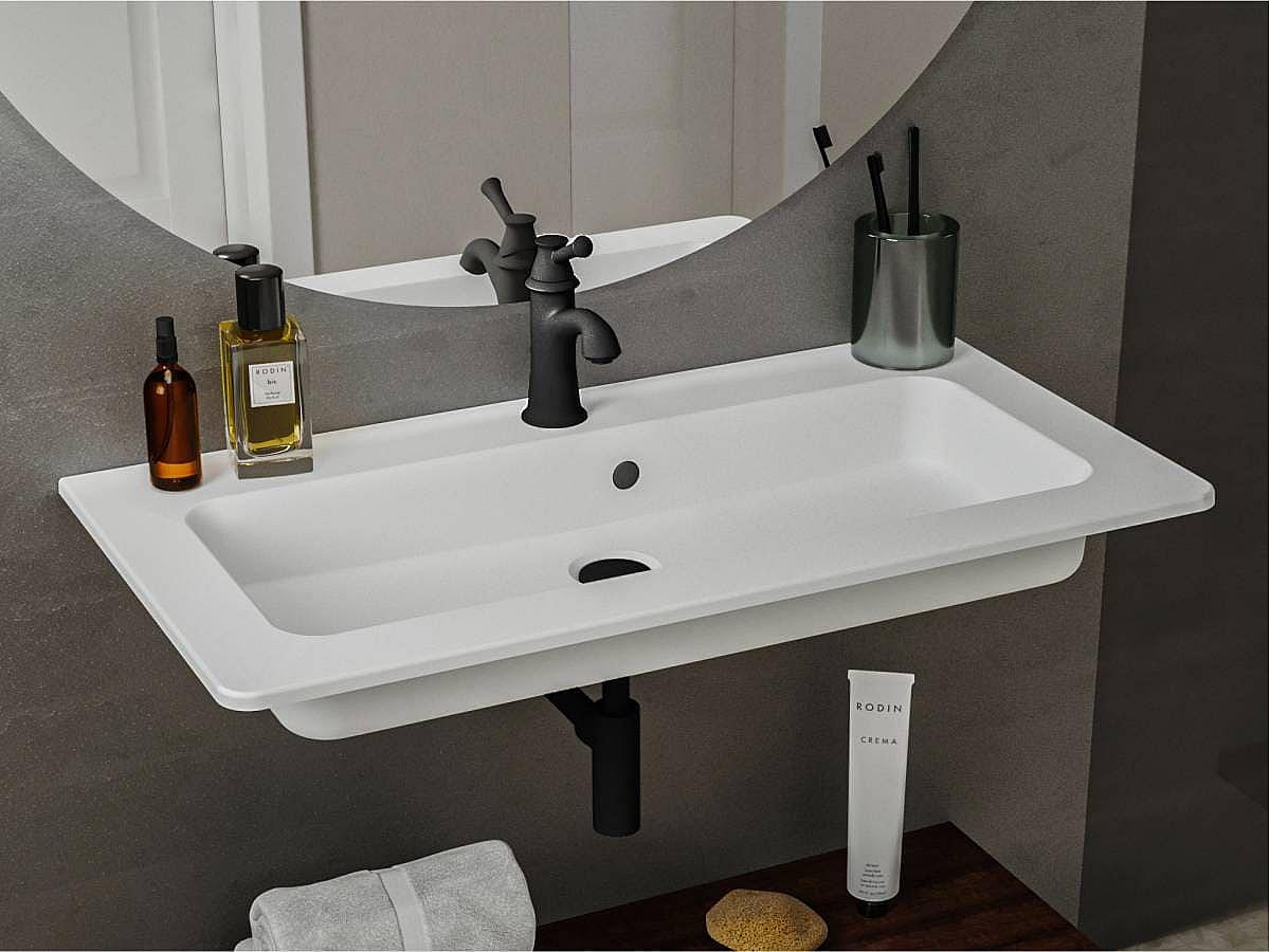 Прямокутний умивальник із литого мармуру ROSTRIKS TRES - витончений аксесуар для ванної кімнати. Плоска чаша обрамлена по периметру акуратними бортами, на яких зручно розмістити гігієнічне приладдя. Умивальник має підвісний тип монтажу.