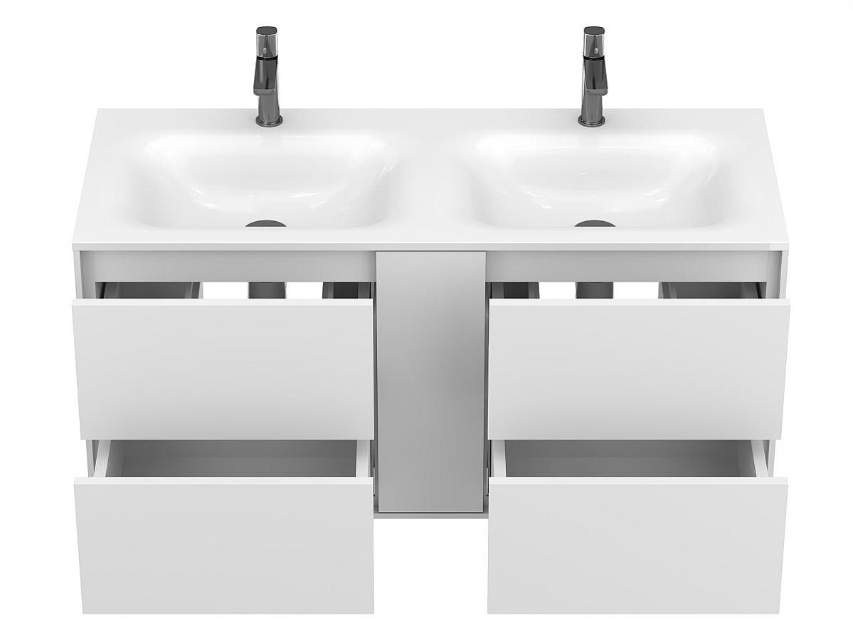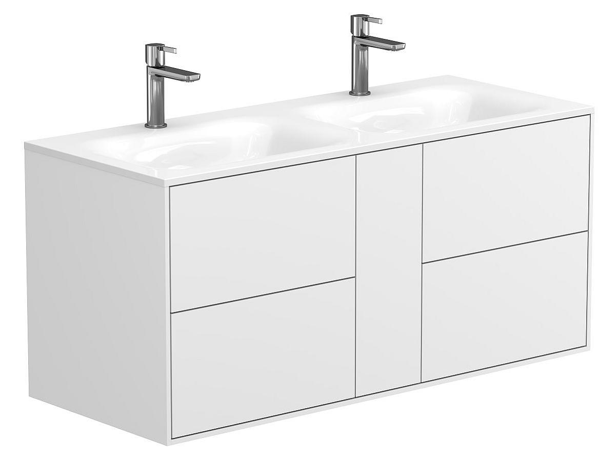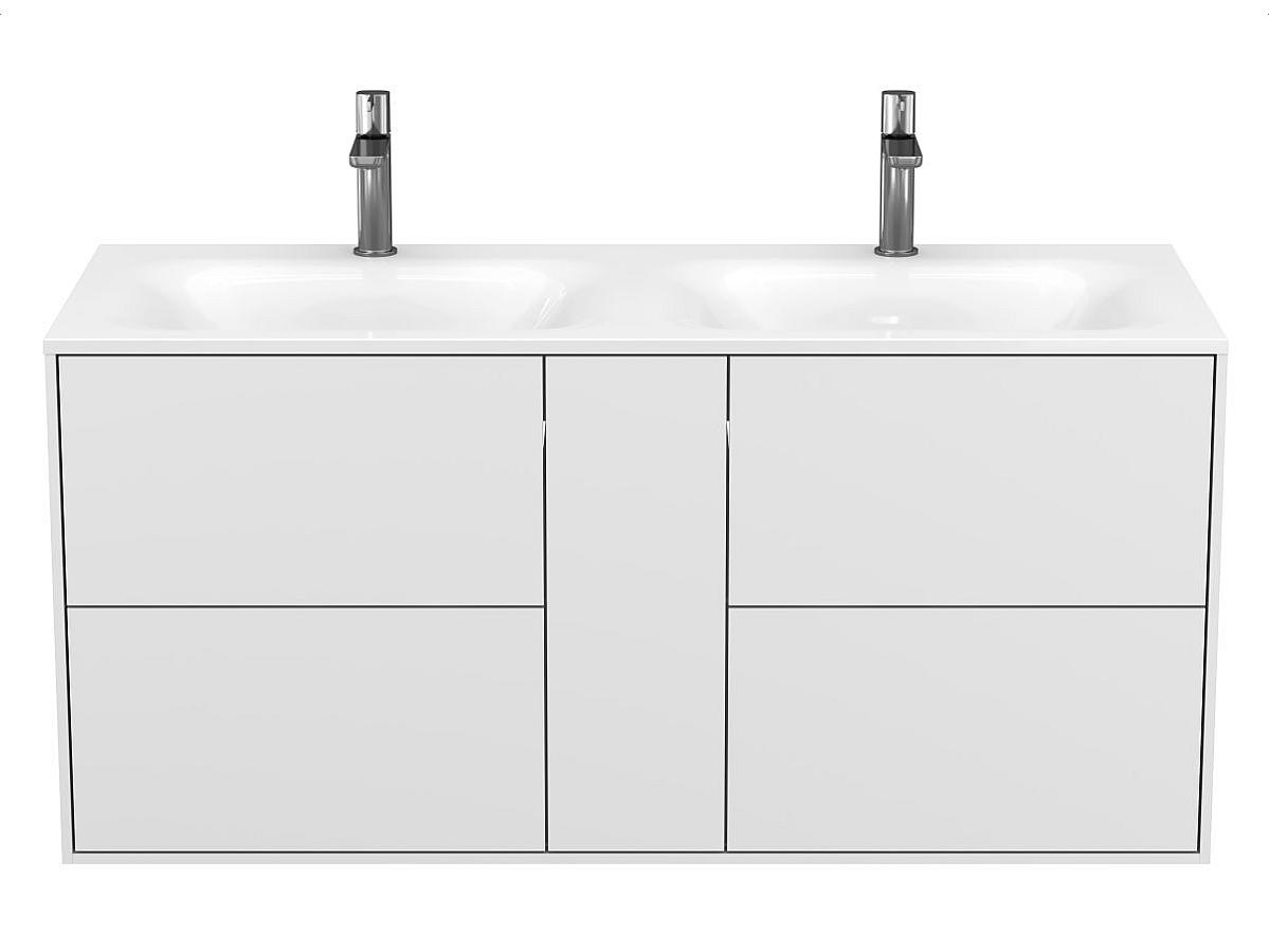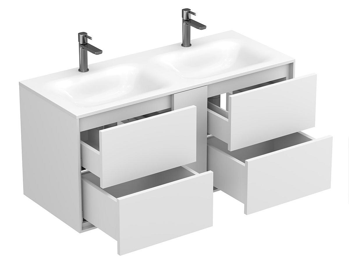Тумба оптимизирована под умывальники с 2-мя чашами и умывальники с крылом серий Della, Jessel, Agness, Lake. Благодаря продуманной геометрии умывальник и тумба образуют целостную композицию.