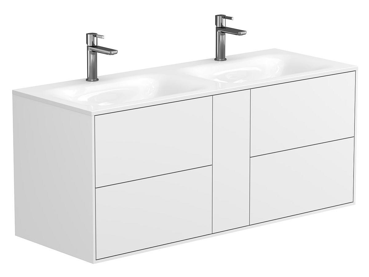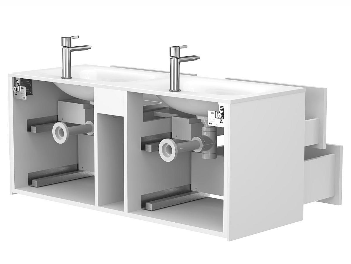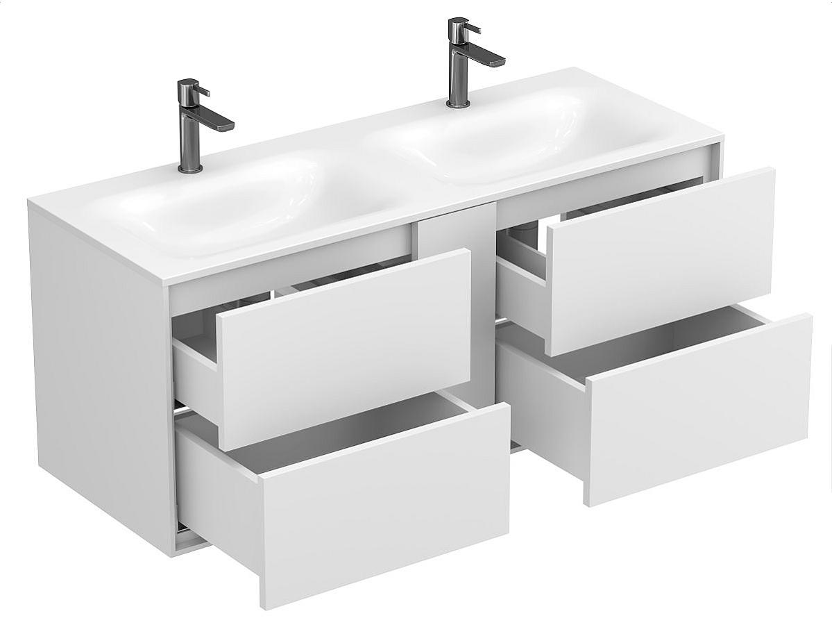 Тумба оптимизирована под умывальники с 2-мя чашами и умывальники с крылом серий Della, Jessel, Agness, Lake. Благодаря продуманной геометрии умывальник и тумба образуют целостную композицию.
