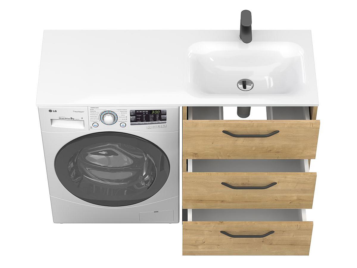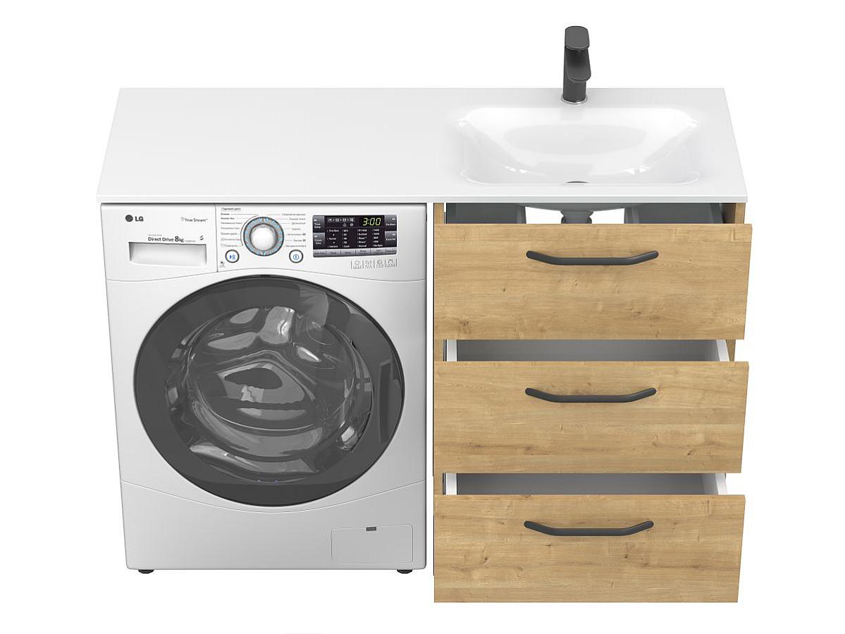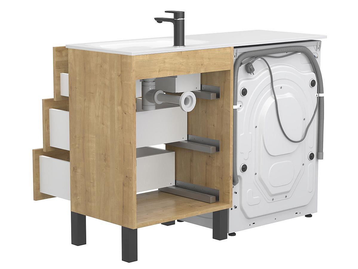 • Гармоничное сочетание техники и мебели. Раковина накрывает тумбу и стиральную машину по всей ширине, образуя единую сплошную поверхность — без стыков и щелей. Это не только удобно в повседневном использовании, но и выглядит стильно и аккуратно.