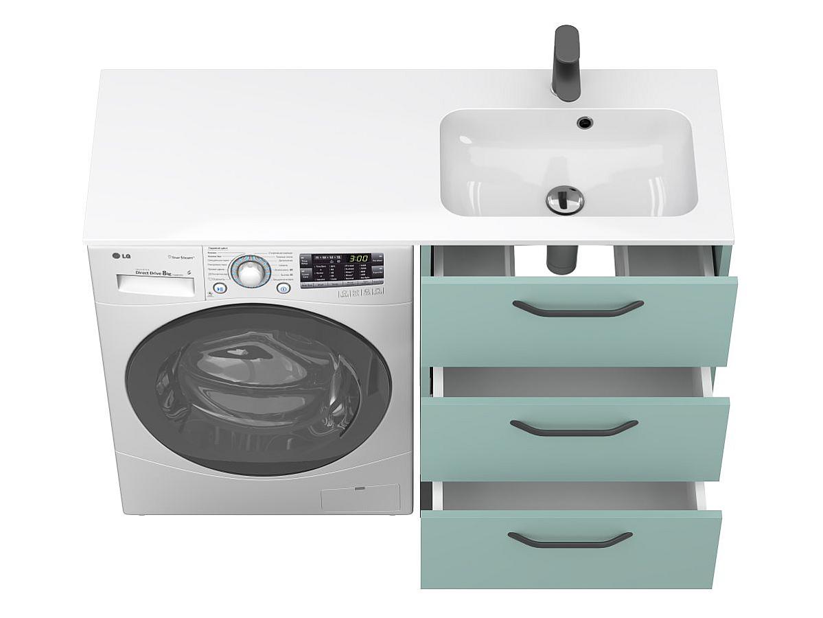 Благодаря продуманной конструкции раковина накрывает сразу и тумбу, и стиральную машину, формируя единую рабочую поверхность и придавая интерьеру завершённый вид.