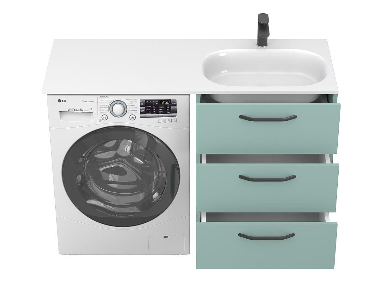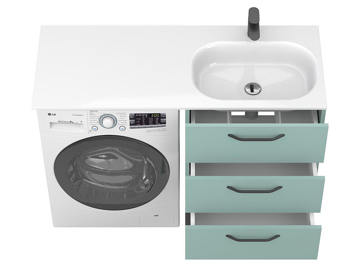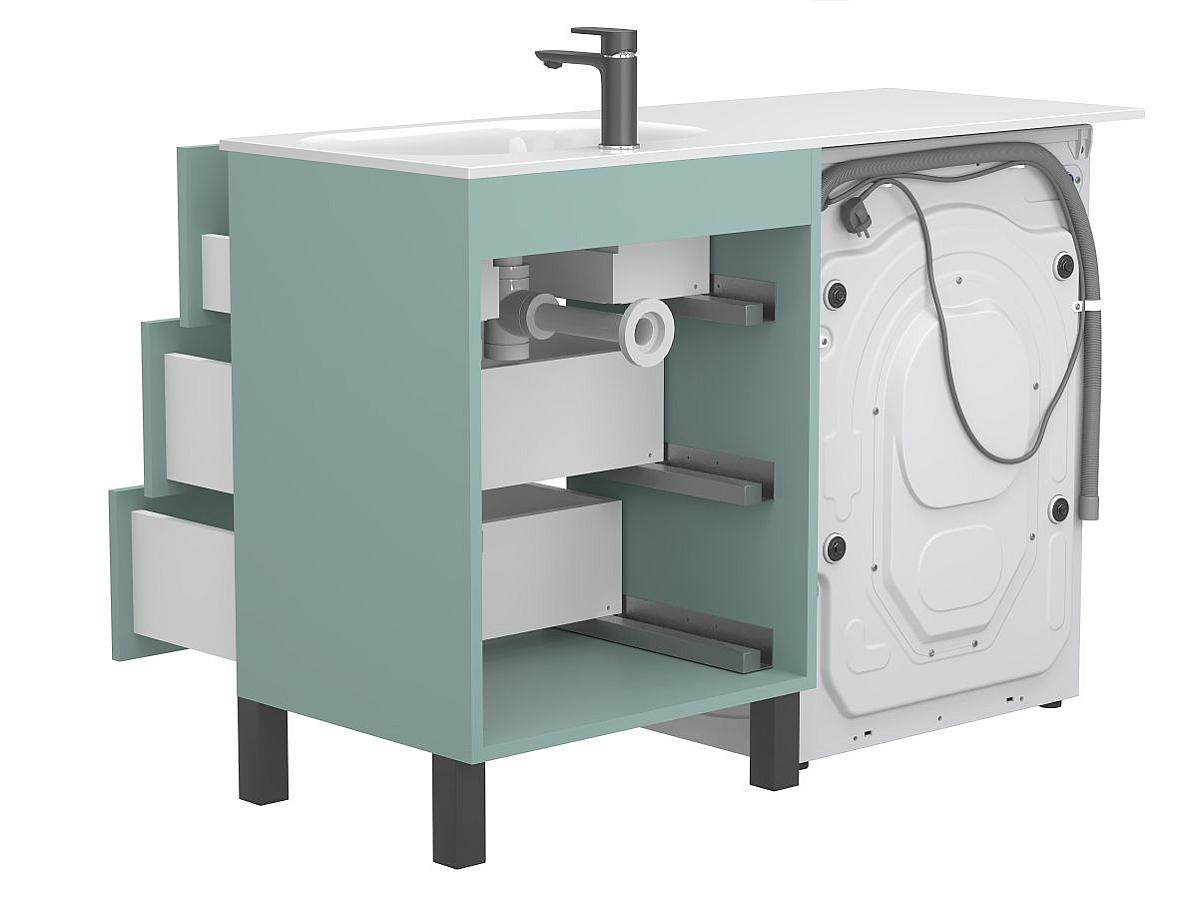 Благодаря продуманной конструкции раковина накрывает сразу и тумбу, и стиральную машину, формируя единую рабочую поверхность и придавая интерьеру завершённый вид.