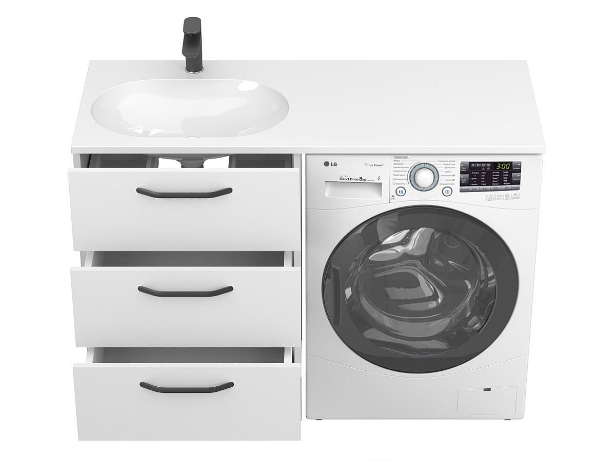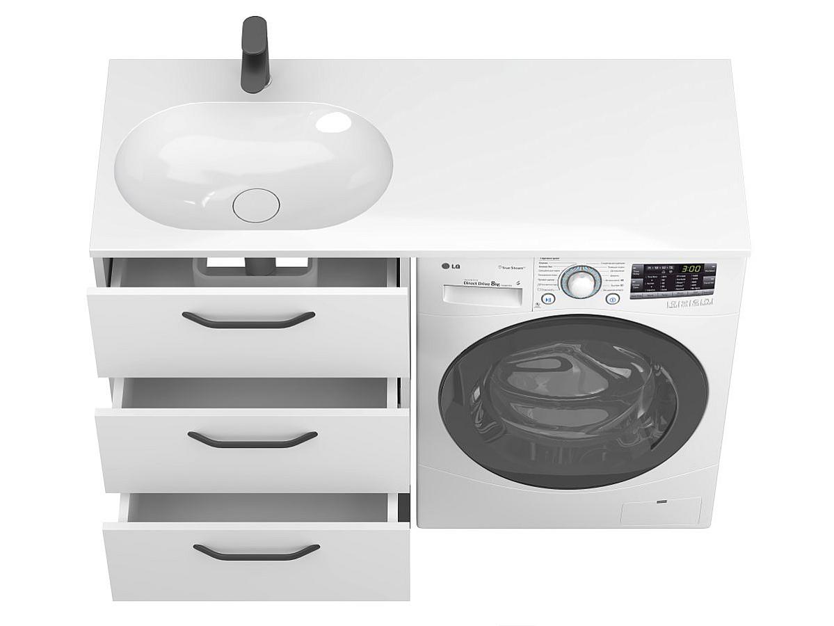 Благодаря продуманной конструкции раковина накрывает сразу и тумбу, и стиральную машину, формируя единую рабочую поверхность и придавая интерьеру завершённый вид.