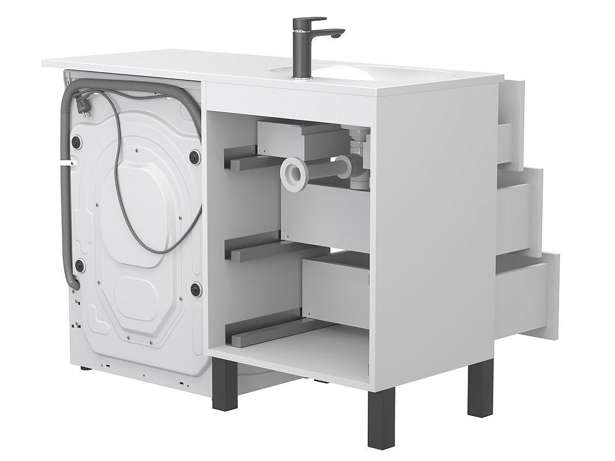 • Гармоничное сочетание техники и мебели. Раковина накрывает тумбу и стиральную машину по всей ширине, образуя единую сплошную поверхность — без стыков и щелей. Это не только удобно в повседневном использовании, но и выглядит стильно и аккуратно.