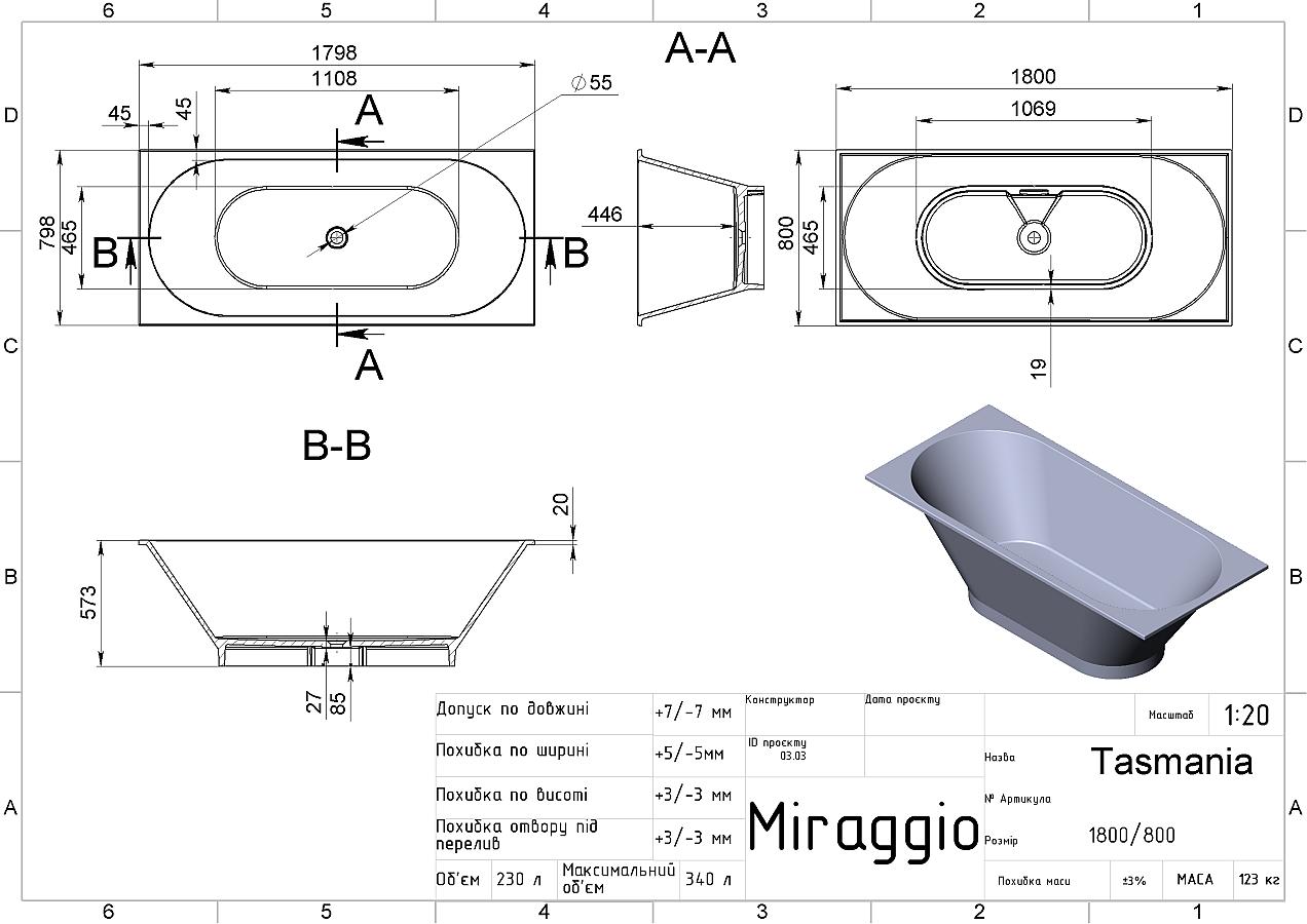 Ванна TASMANIA має середні розміри 1800x800 мм та місткість 340 л, її легко інтегрувати у ванній кімнаті середнього розміру. Вага ванни 123 кг. У заводському варіанті отвір під змішувач відсутній, проте можна замовити його виготовлення як спецзамовлення. Як додаткова опція доступне кольорове покриття зовнішньої стінки ванни за палітрою RAL.