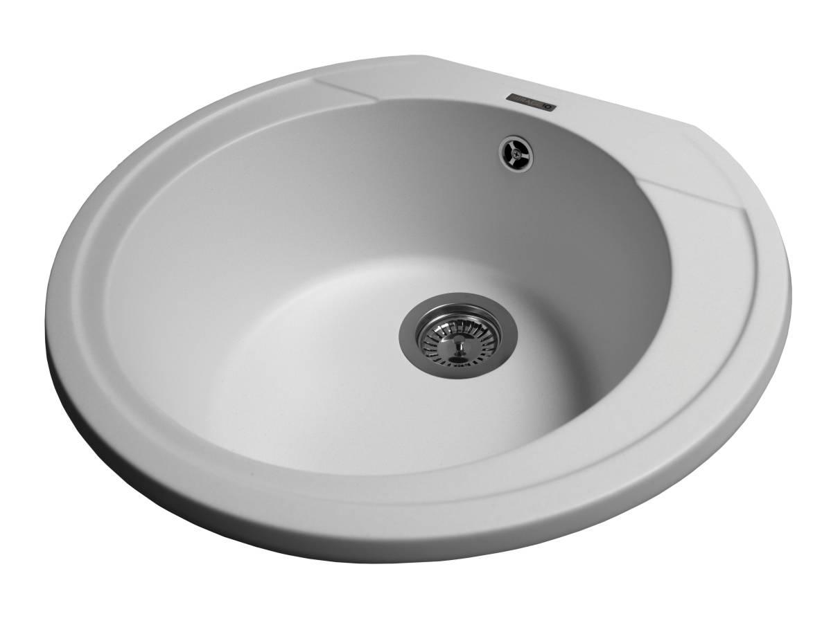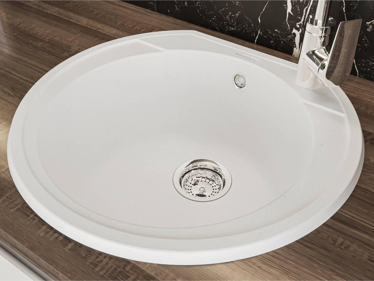 Біла кругла кухонна мийка з кварцового піску TULUZA дуже містка, незважаючи на свої габарити. Біля змішувача можна поставити миючий засіб. Ця модель підійде під будь-який дизайн інтер'єру. Мийка має врізний тип монтажу.