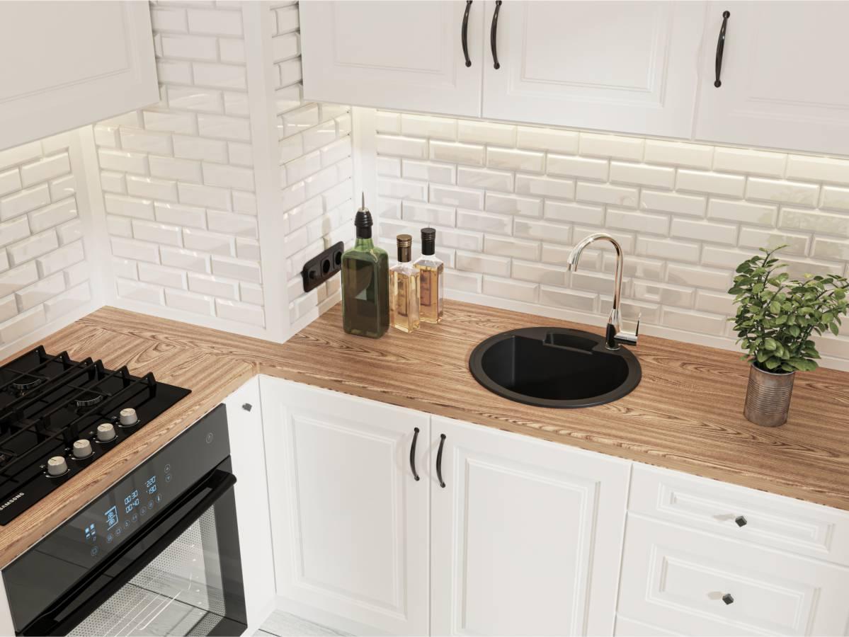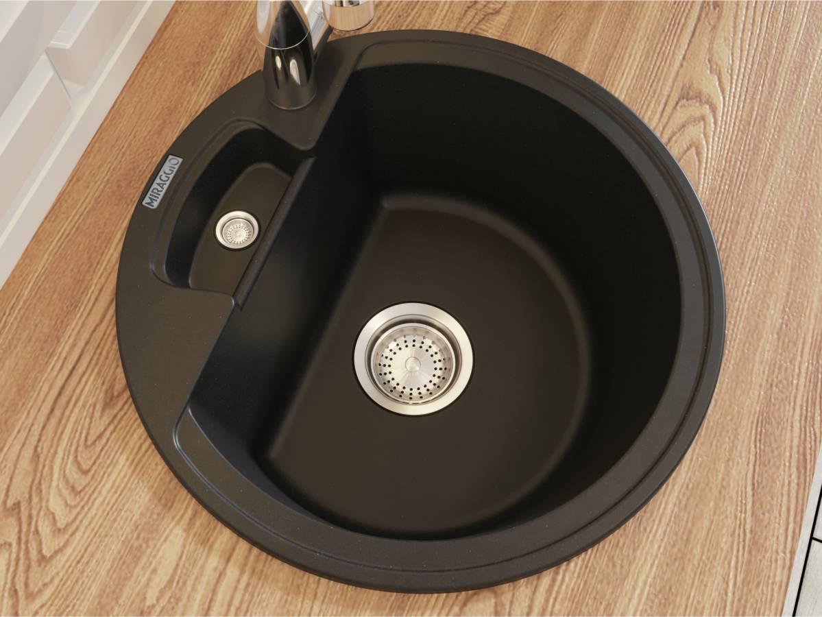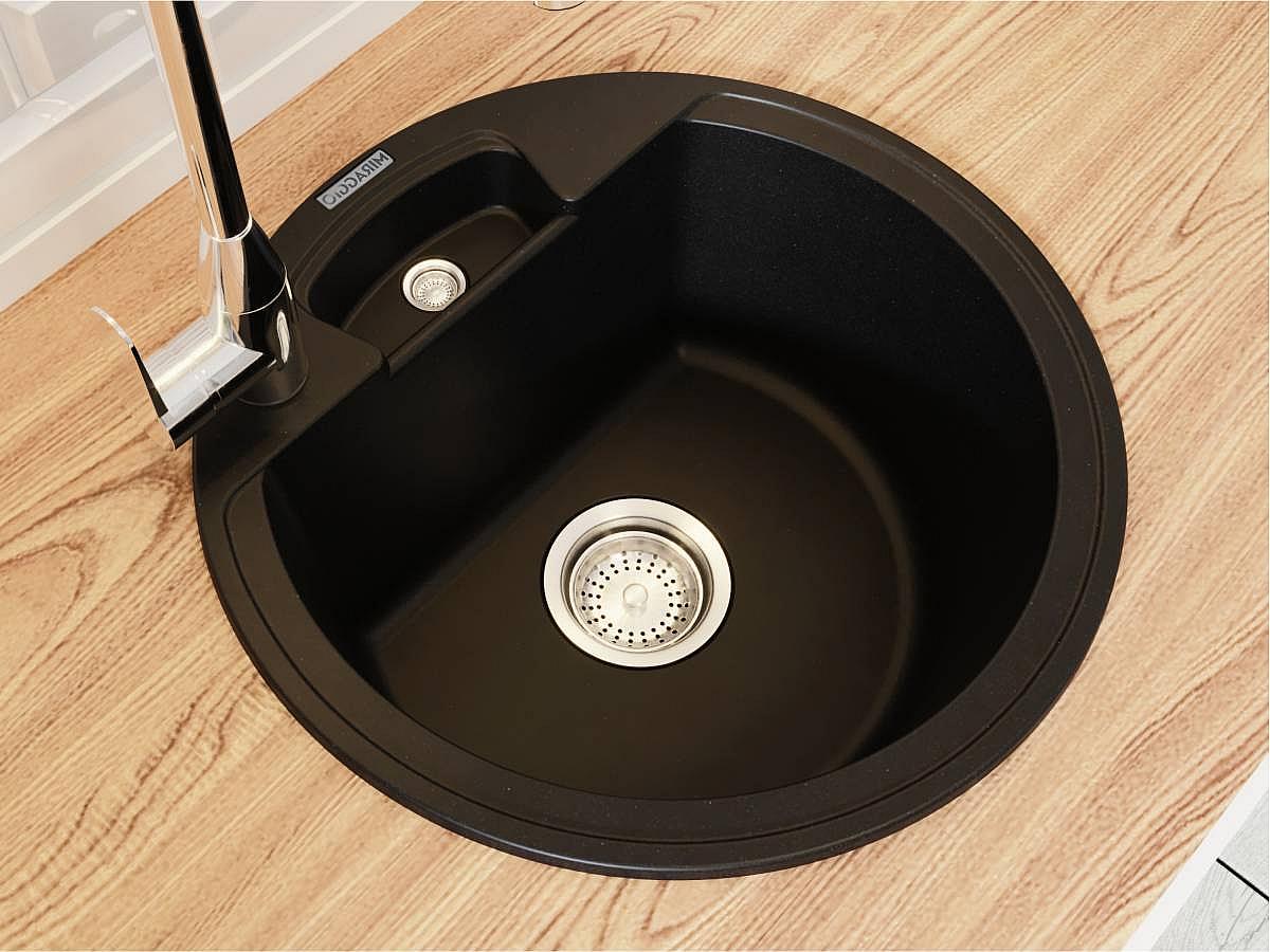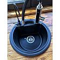Чорна кругла кухонна мийка з кварцового піску VALENCIA - наша найкомпактніша модель. Універсальна мийка, яке підійде під будь-який дизайн кухні. Змішувач можна розмістити праворуч або ліворуч, вибір за вами. Біля змішувача можна поставити миючий засіб. Мийка має врізний тип монтажу.