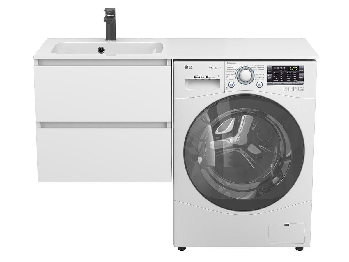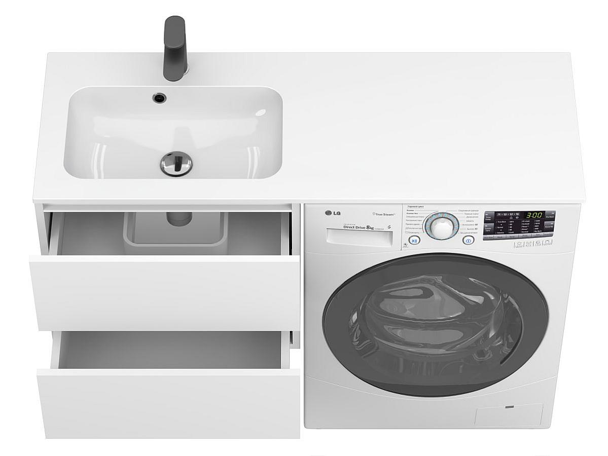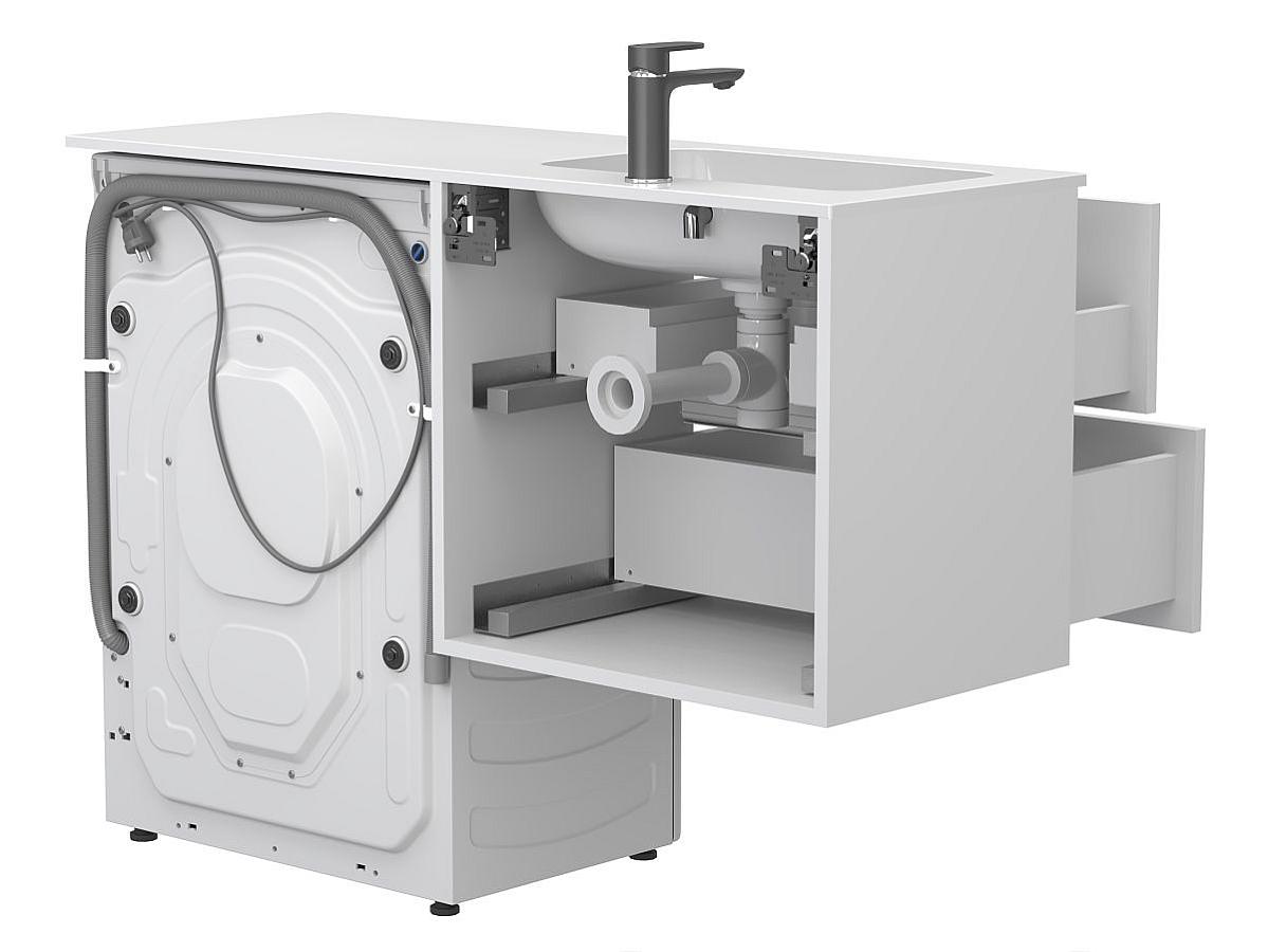 • Інтегроване рішення “3-в-1”. Тумба, умивальник і пральна машина об’єднані в єдину композицію. Умивальник накриває всю верхню поверхню, закриваючи тумбу й техніку — без розривів і стиків. Це створює враження цілісності, чистоти ліній і впорядкованості.