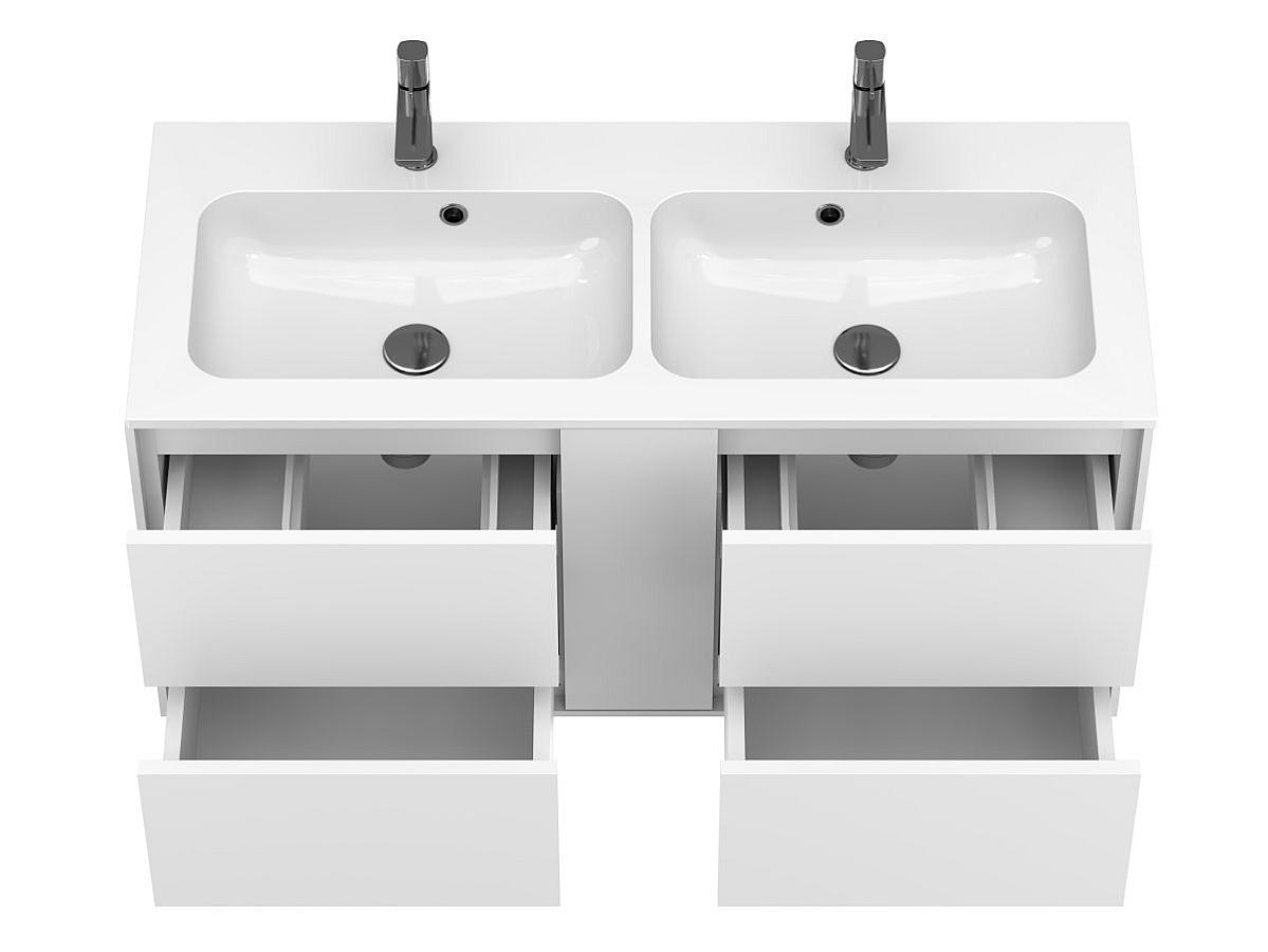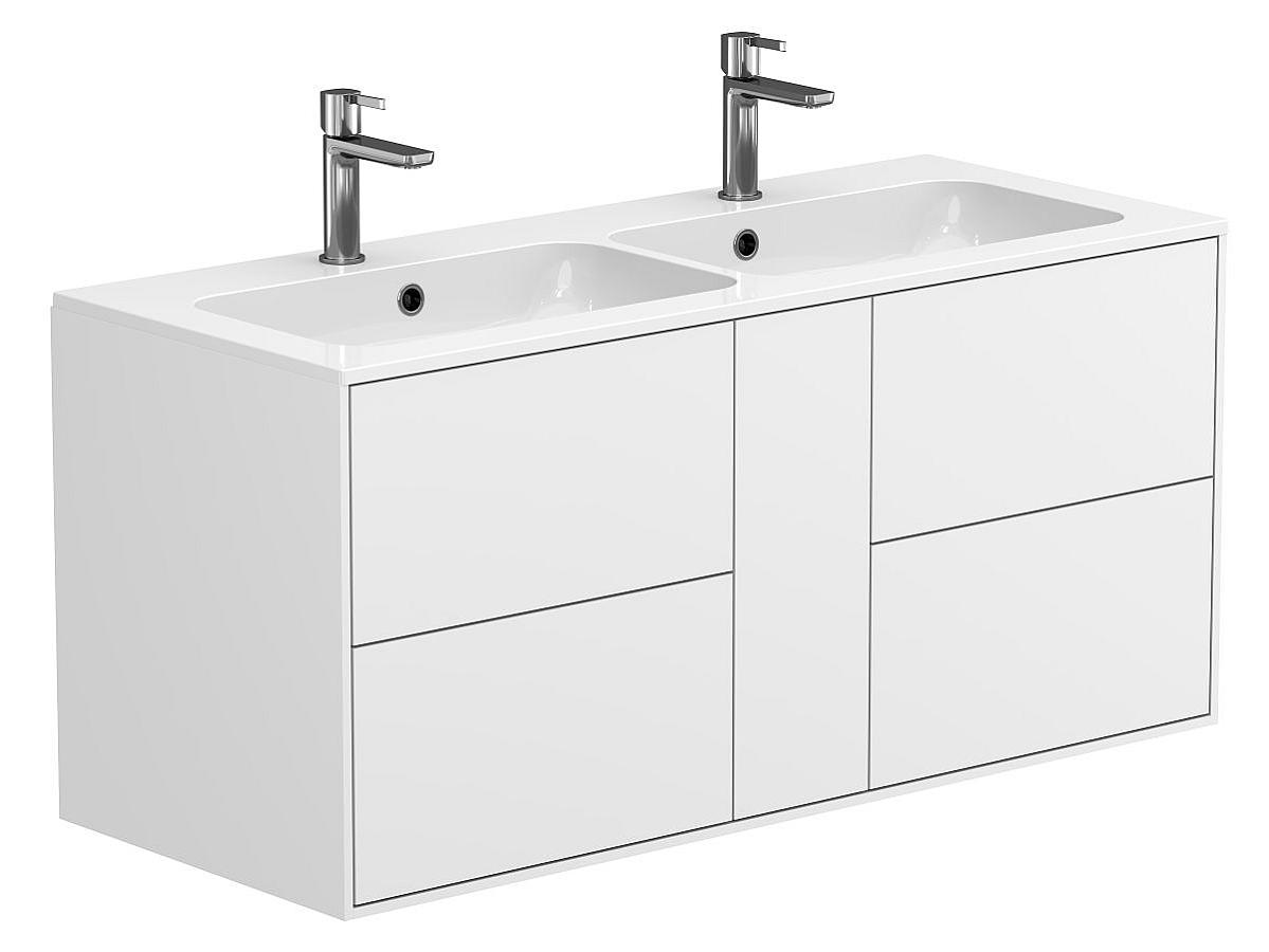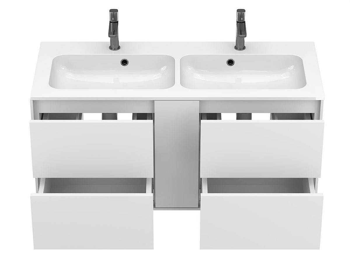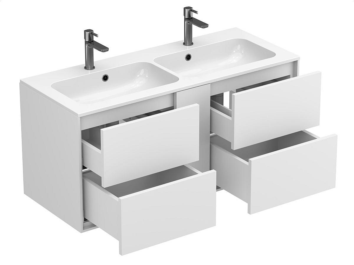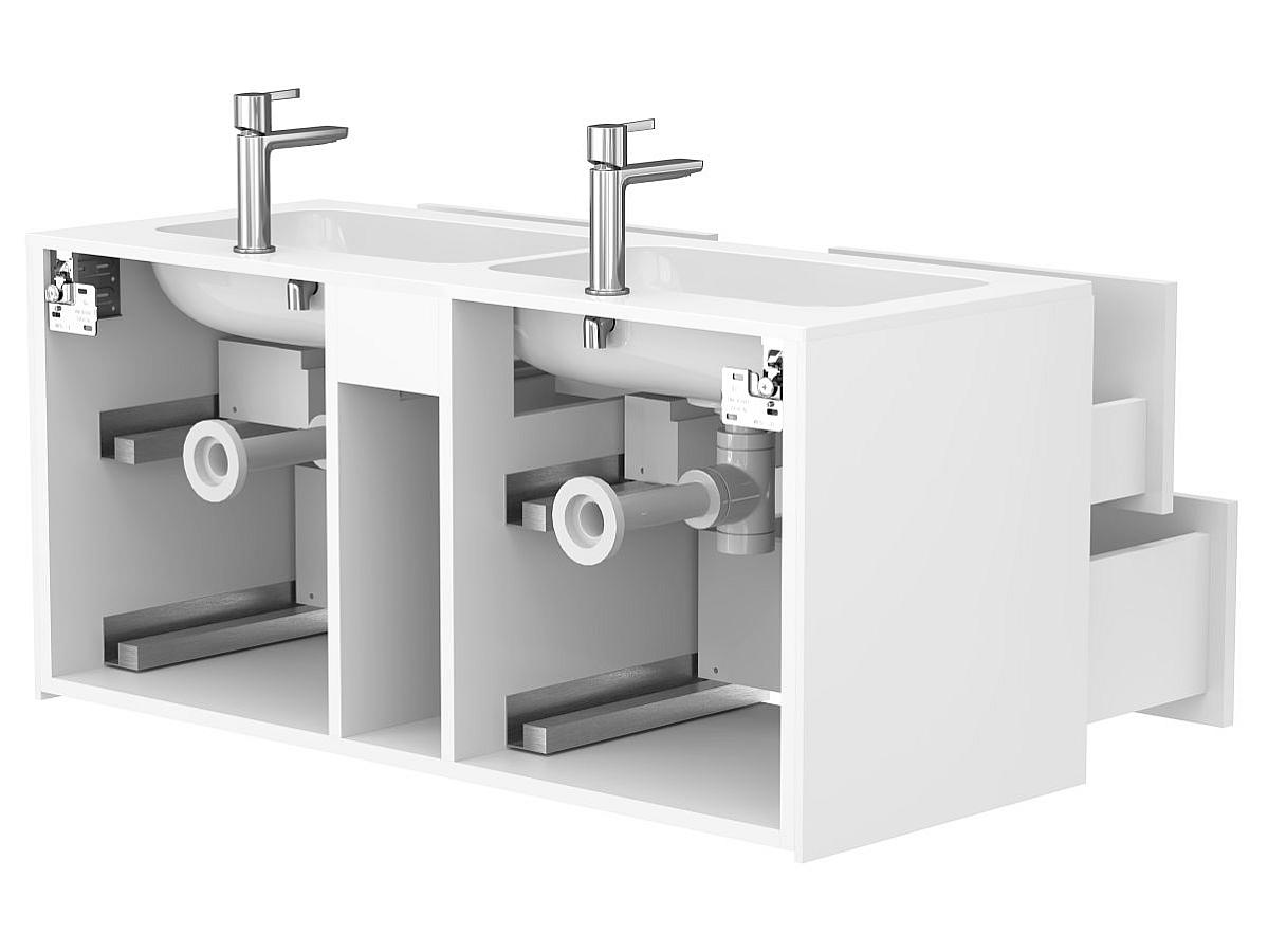 Тумба оптимізована під умивальники з 2-ома чашами та умивальники з крилом серій Della, Jessel, Agness, Lake. Завдяки продуманій геометрії, умивальник та тумба утворюють цілісну композицію.