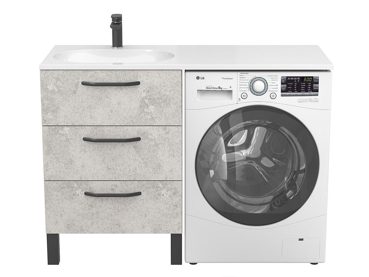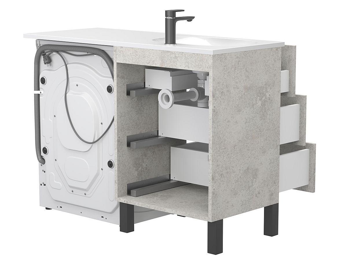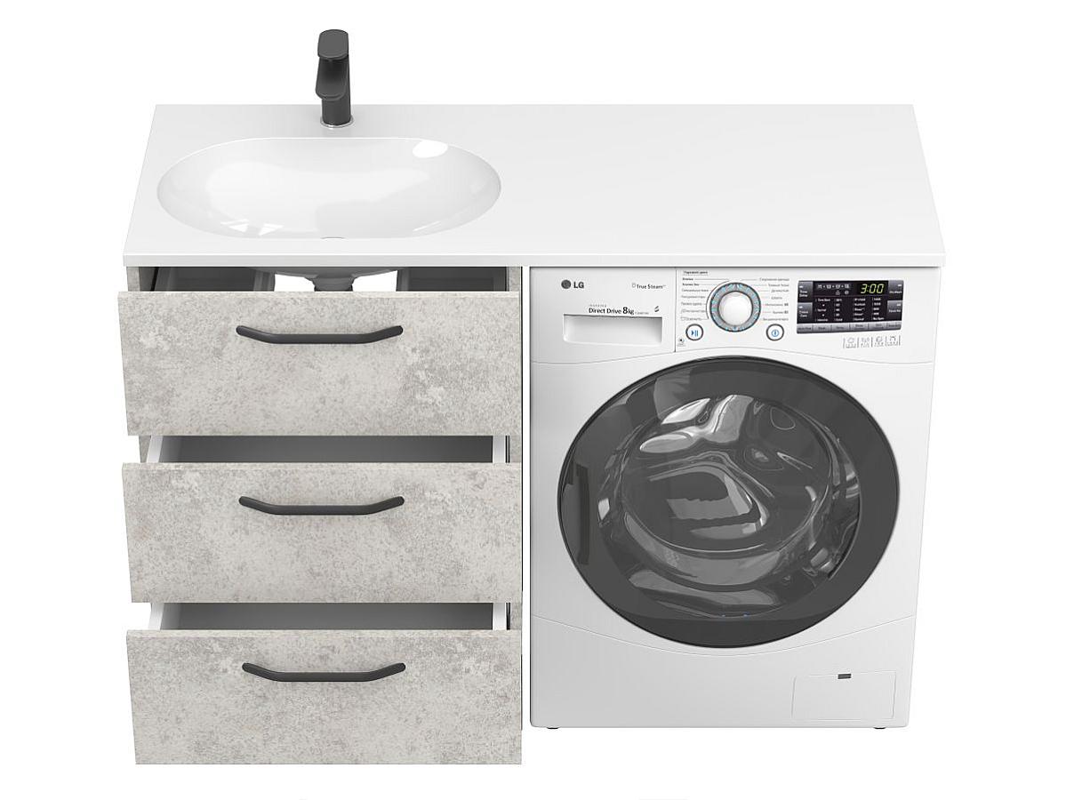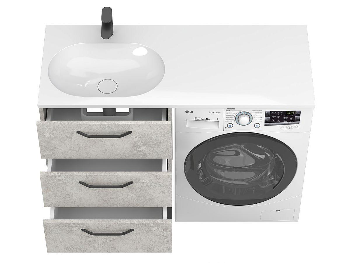 Завдяки розумній конструкції, умивальник накриває одразу і тумбу, і пральну машину, утворюючи єдину робочу поверхню та надаючи інтер’єру завершеного вигляду.