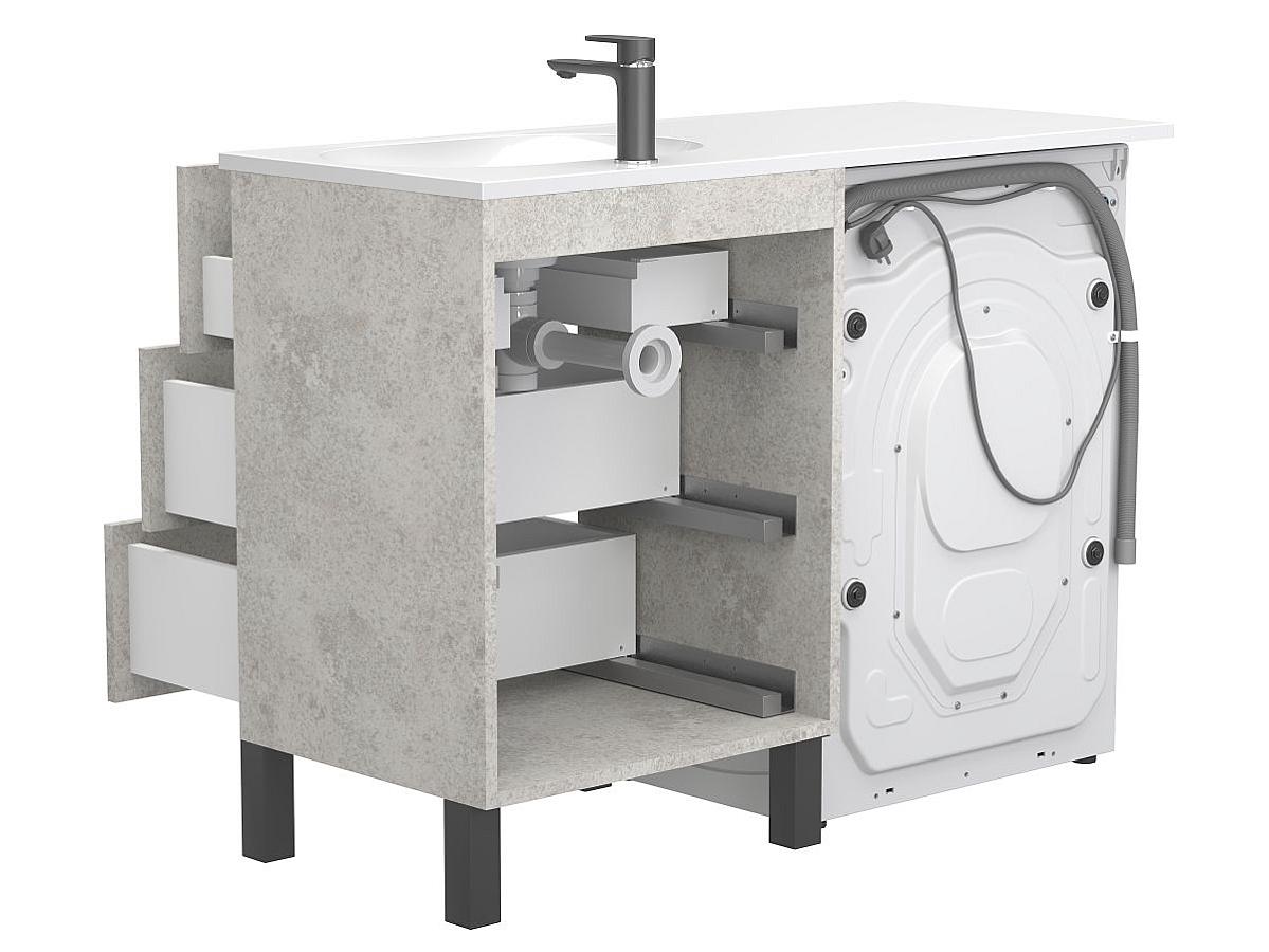 *Тумба постачається в комплекті з умивальником. Пральна машина не входить до комплекту та візуалізується для прикладу інтеграції. **Ціна залежить від обраної конфігурації (кількість шухляд, матеріал, умивальник, оздоблення тощо).