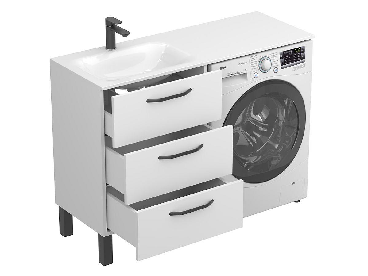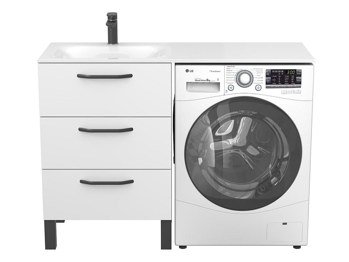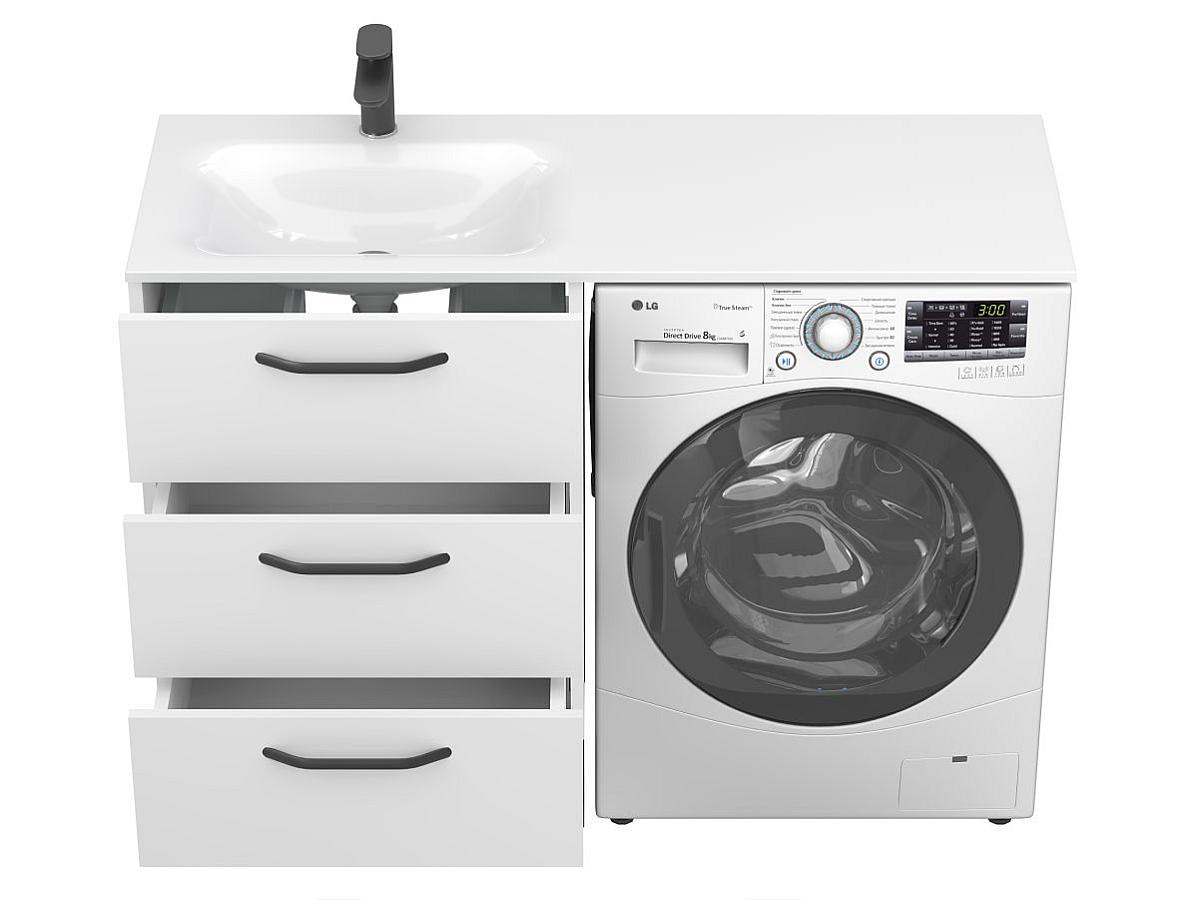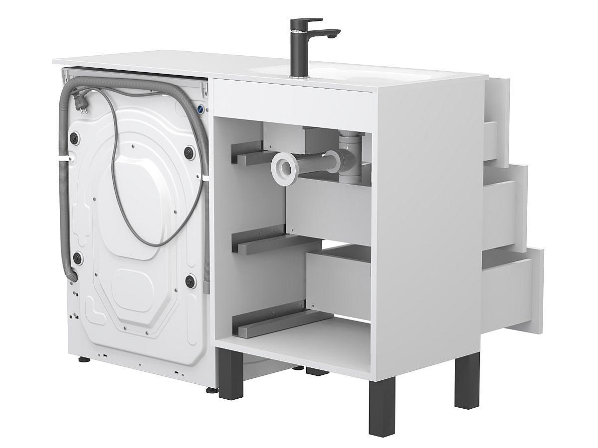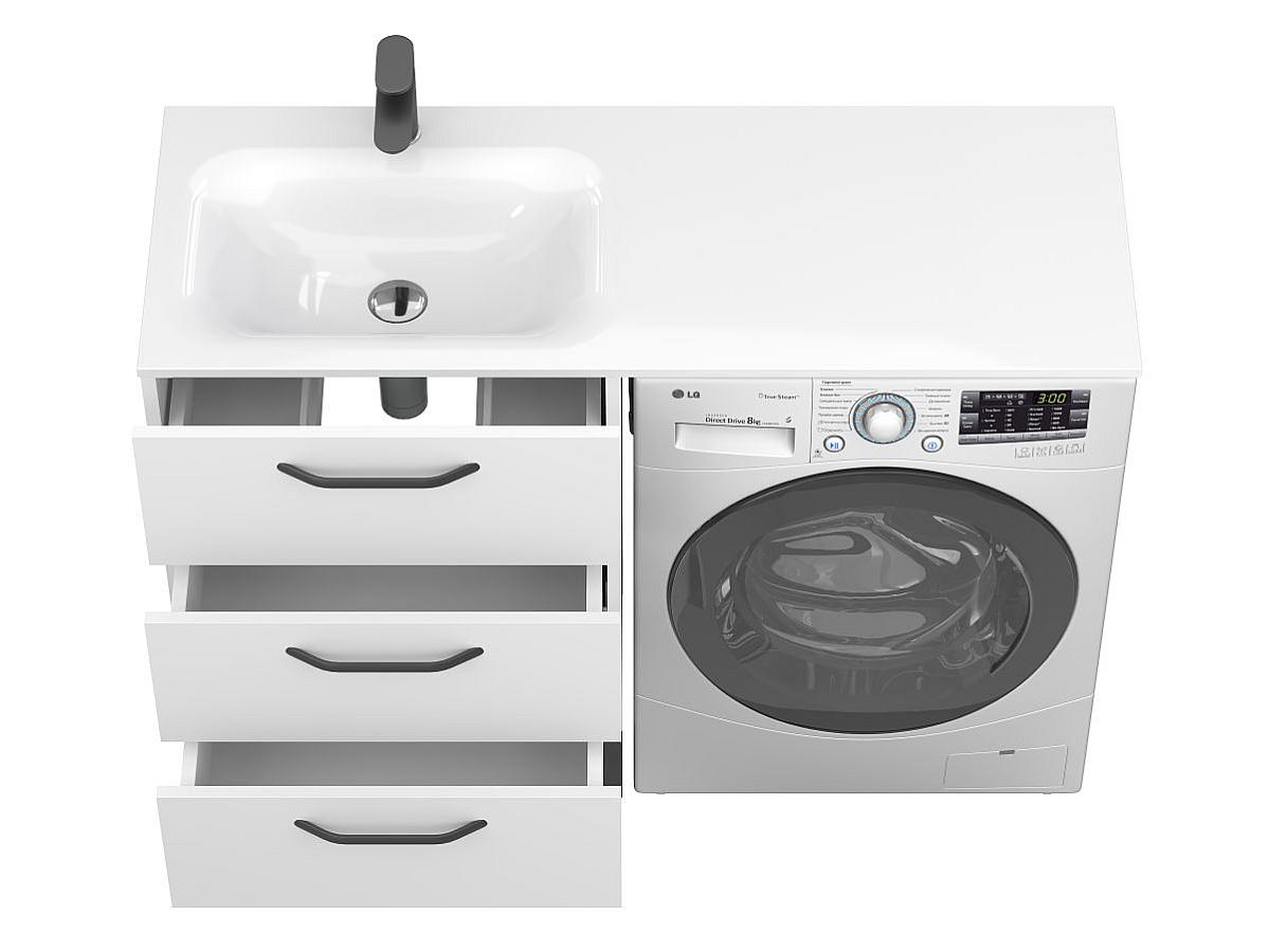 Завдяки розумній конструкції, умивальник накриває одразу і тумбу, і пральну машину, утворюючи єдину робочу поверхню та надаючи інтер’єру завершеного вигляду.