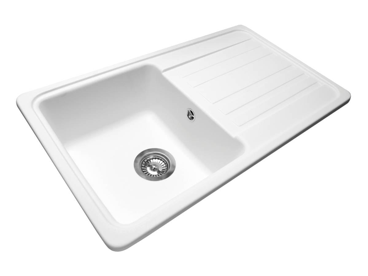 Прямокутна біла кухонна мийка із кварцового піску VERSAL - це простір дій на кухні. Модель має об'ємну прямокутну чашу та ребристе неслизьке крило. Мийка має врізний тип монтажу.
